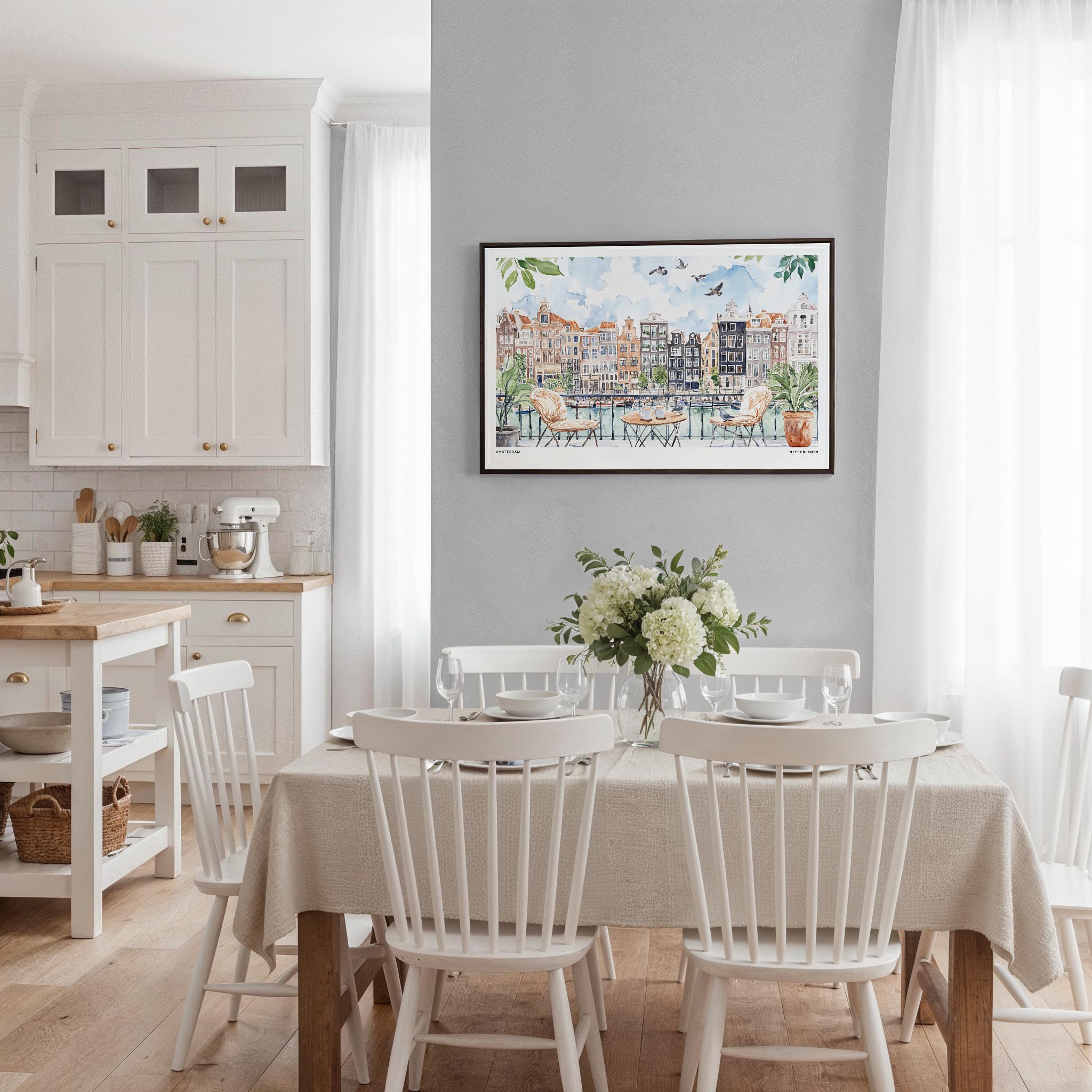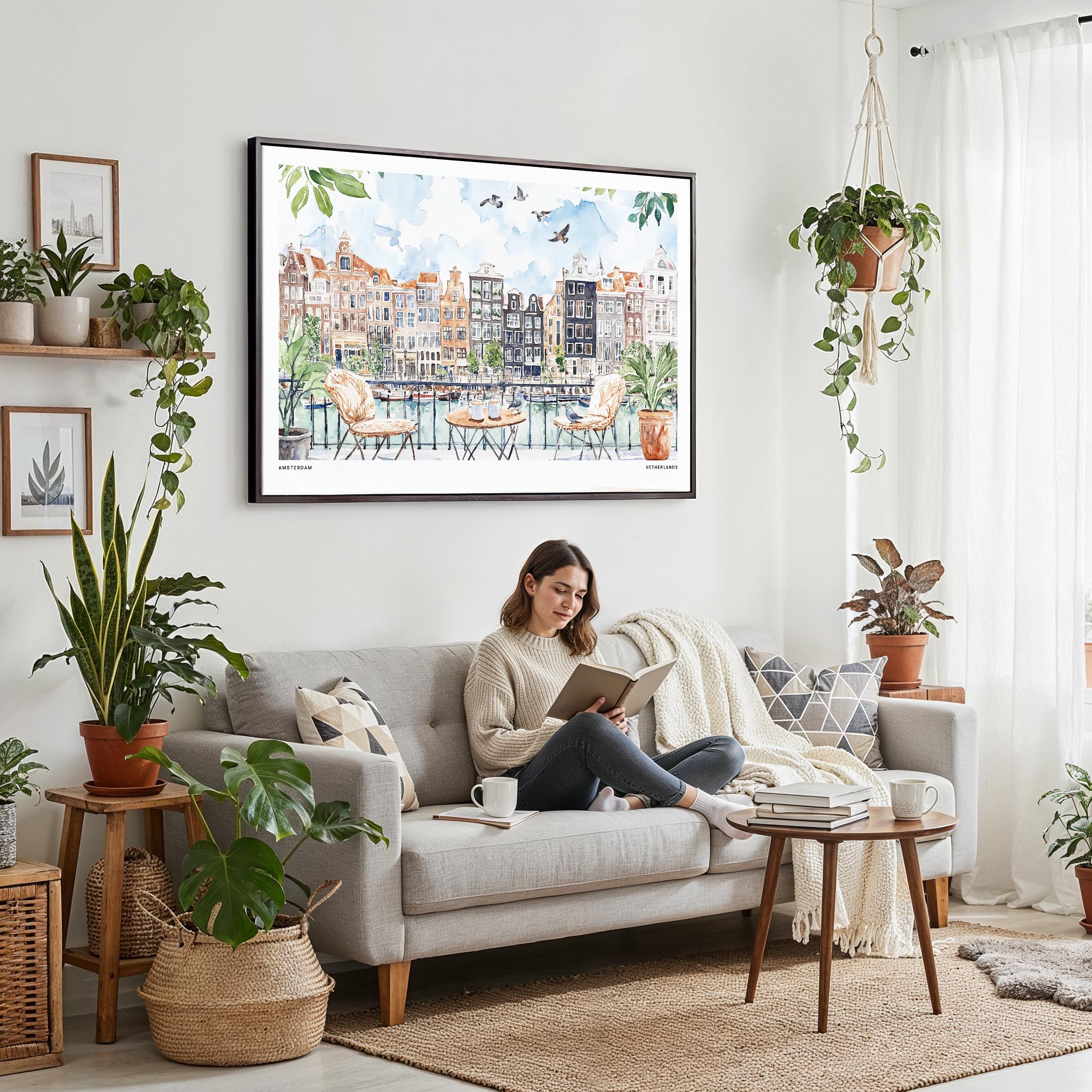 This artwork features a delightful view of Amsterdam’s canals, framed by colorful buildings and cozy outdoor seating. The soft watercolor style invites a sense of warmth and tranquility into any space. Printed on a stretched canvas with fade-resistant inks, it’s ready to hang right away. Ideal for living rooms, bedrooms, or offices, this piece makes a thoughtful gift for anyone who loves travel or unique cityscapes.