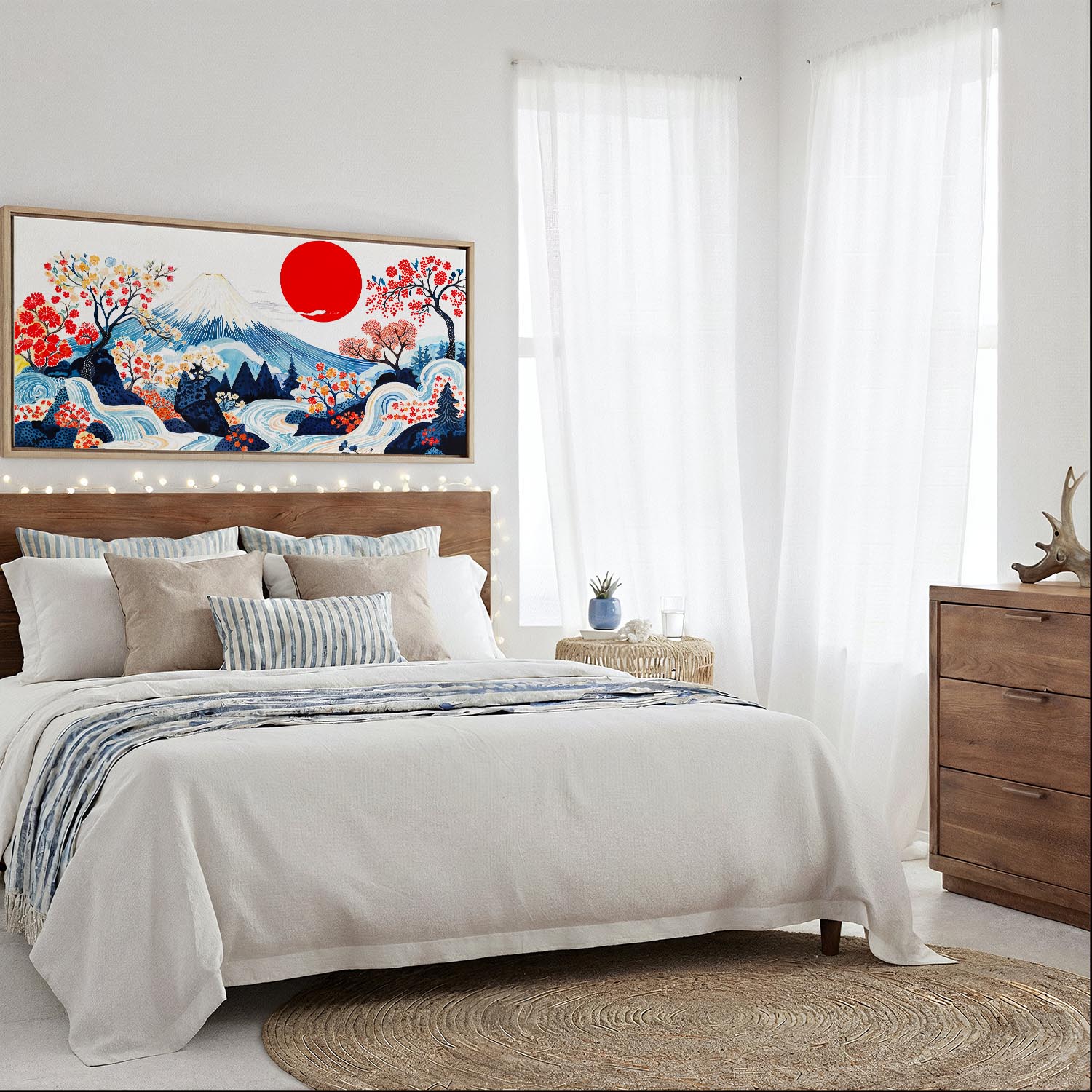 This canvas print captures the iconic Mount Fuji in a stunning abstract landscape, framed by colorful cherry blossoms and gentle waves. The wide 2:1 format enhances the room’s ambiance, making it feel open and inviting. Crafted from high-quality materials, this piece features hand-stretched canvas, solid wood stretcher bars, and fade-resistant inks, all in a matte finish ready to hang. It’s a wonderful addition above a sofa, in a hallway, or within an office setting. Ideal for personal enjoyment or as a thoughtful gift for art lovers.