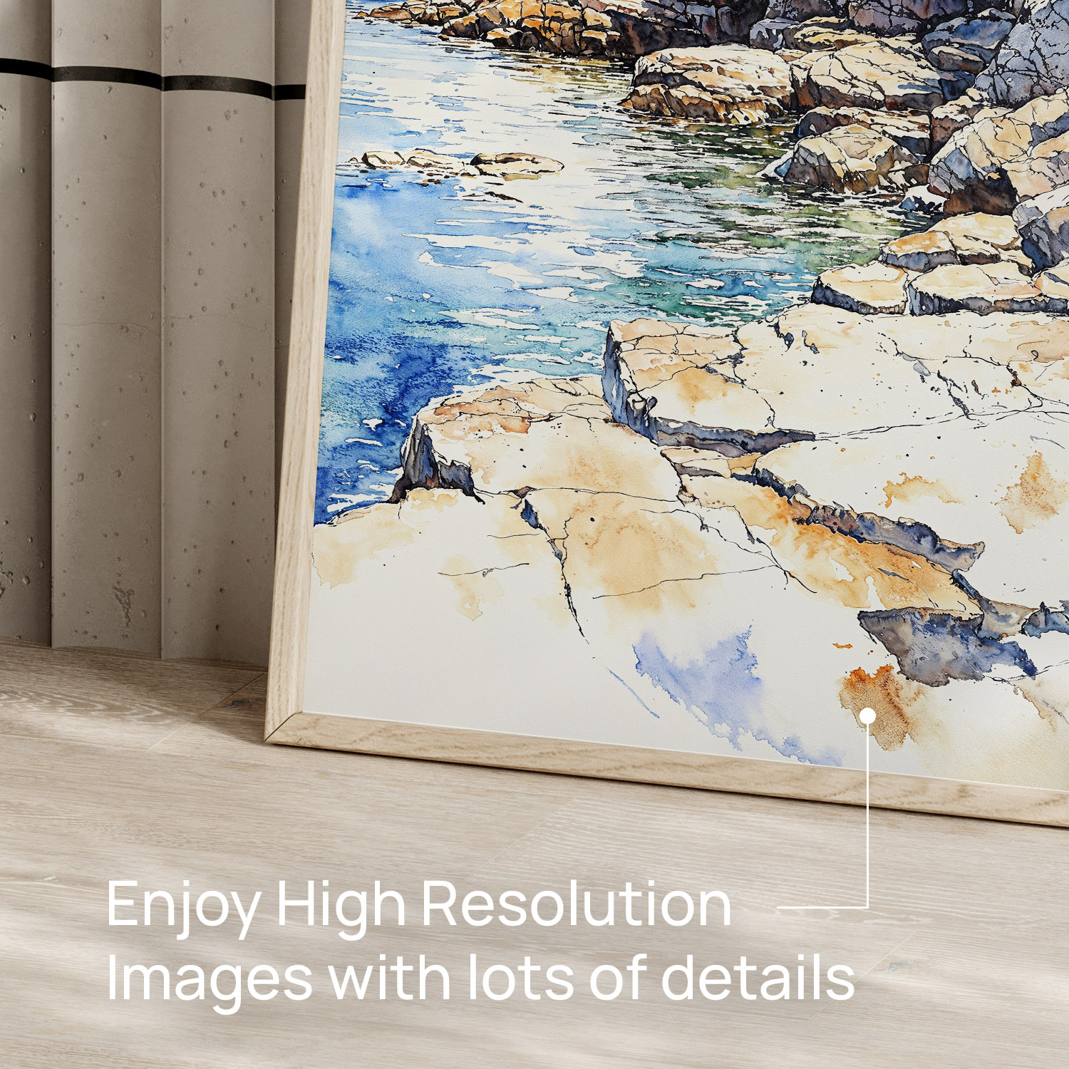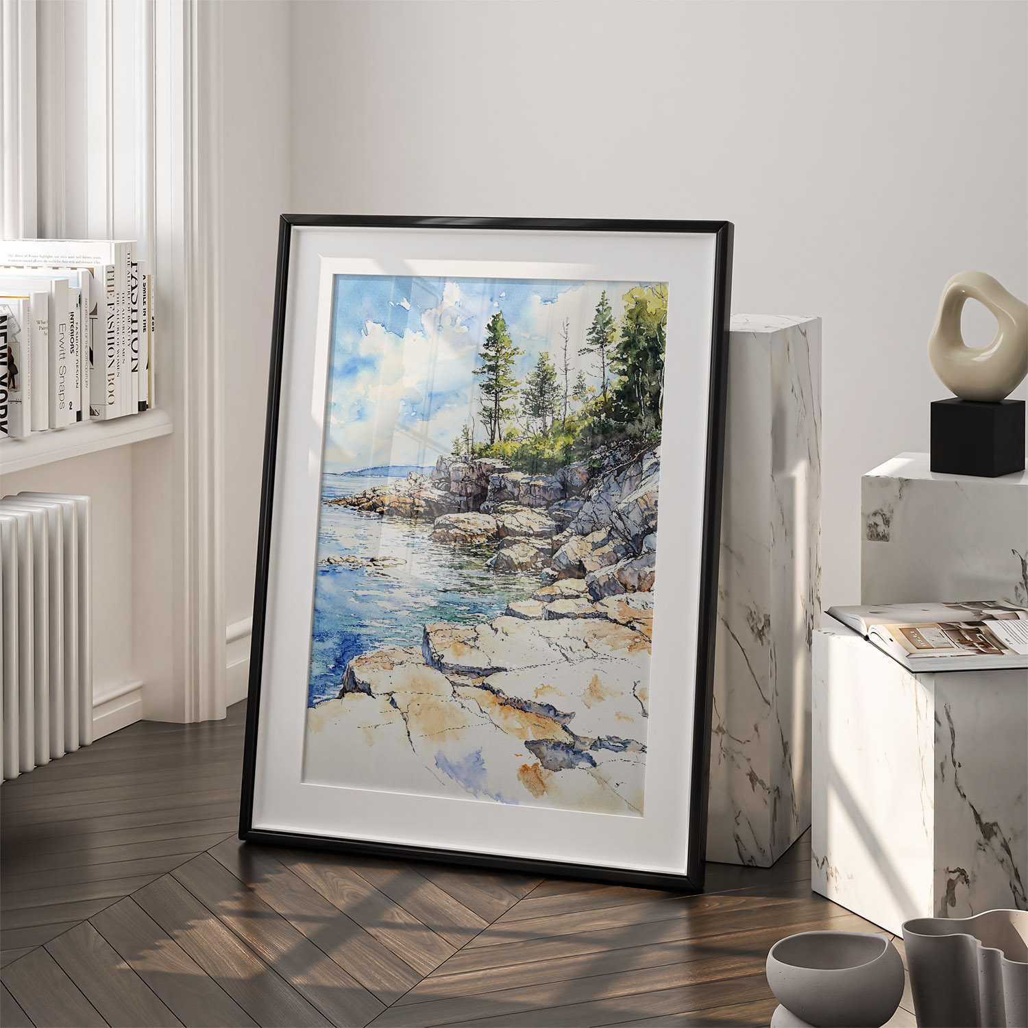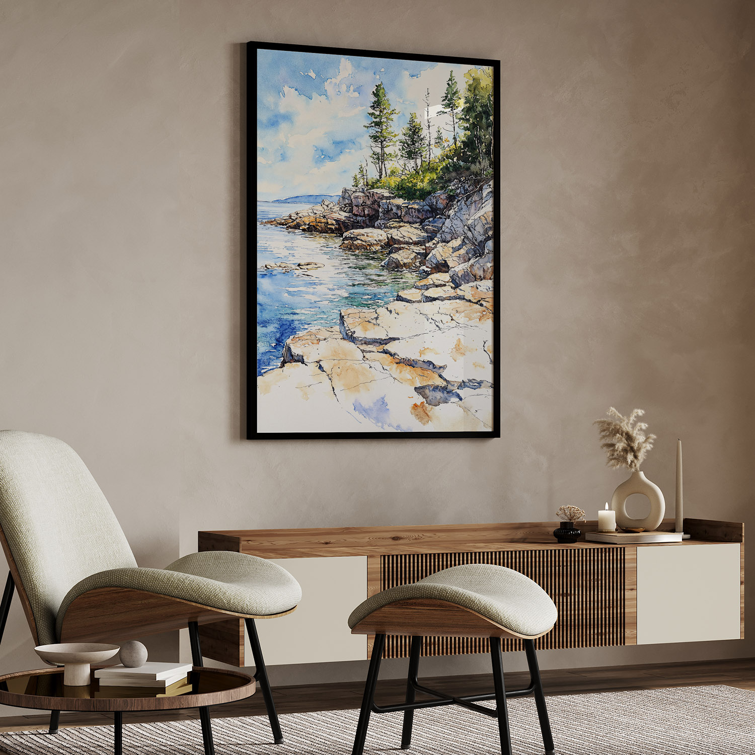 This artwork beautifully captures the serene coastline of Acadia National Park, offering a glimpse of rocky shores and lush greenery. The soothing colors create a warm and inviting atmosphere, perfect for evoking memories of nature or enhancing your home. Delivered as a high-resolution digital file, you can effortlessly print it at home or through a local print shop. Ideal for living rooms, bedrooms, or offices, this artwork brings a touch of nature and tranquility to any space, allowing for immediate enjoyment and personalization.