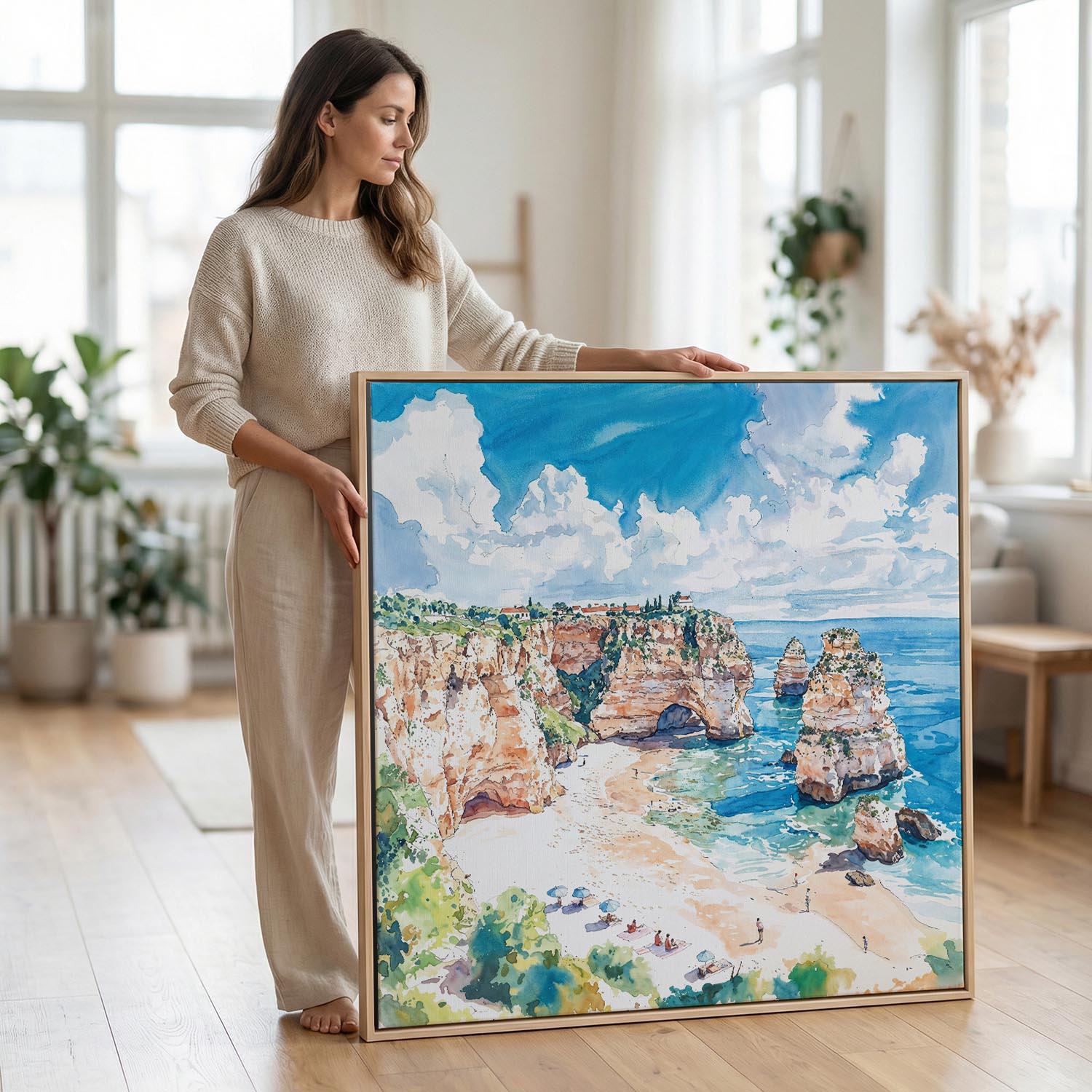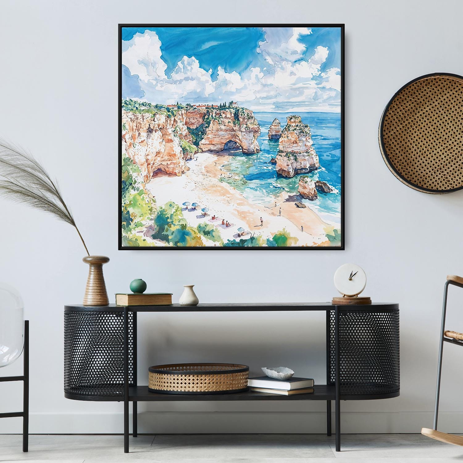 Algarve Portugal Coastal Canvas Print | Coastal Beach Landscape Square Artwork in Watercolor Style