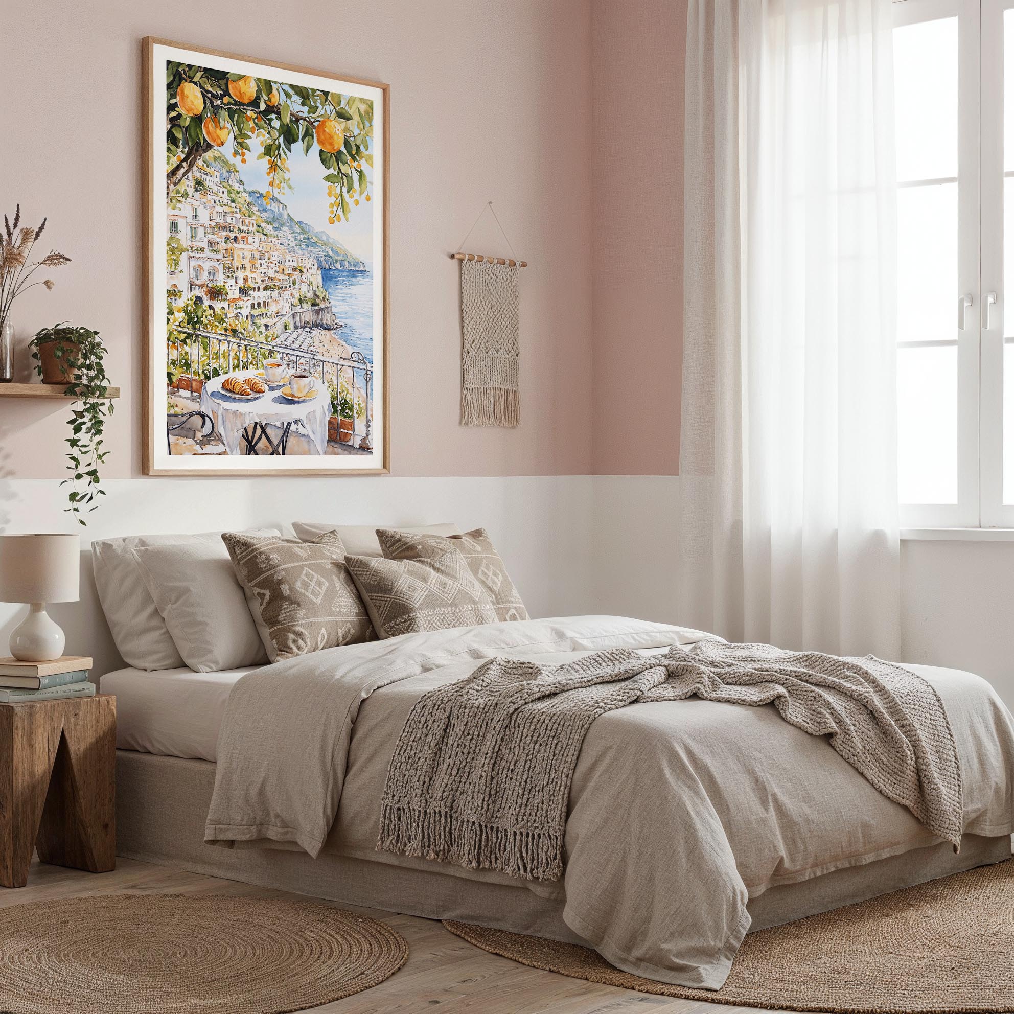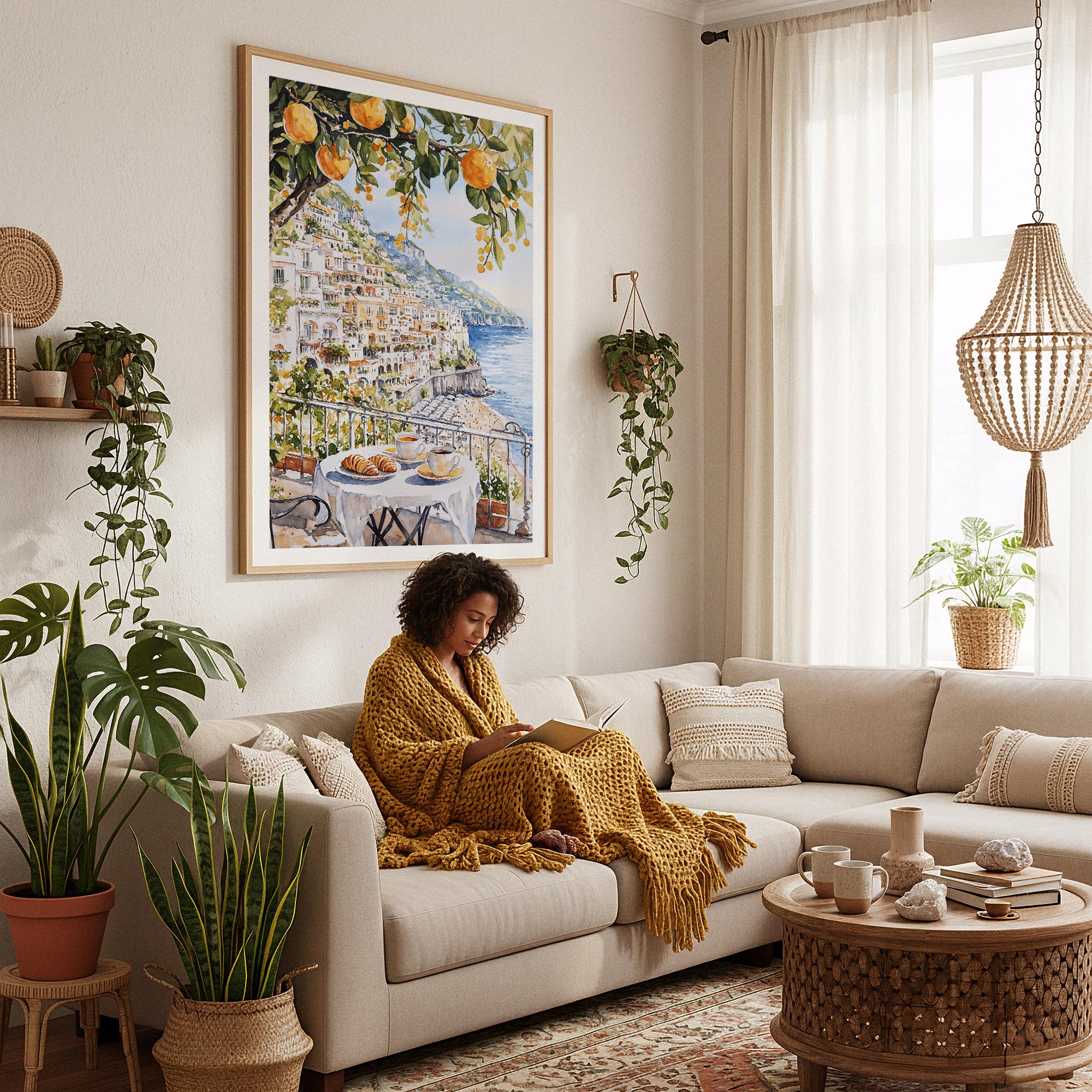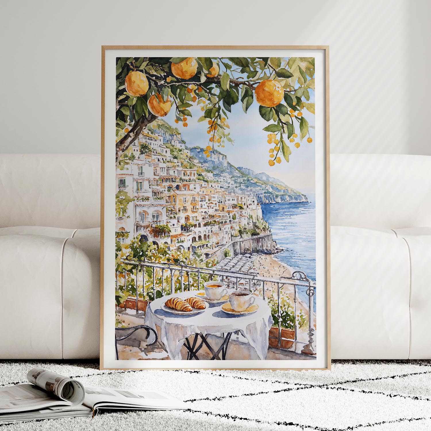 Capture the essence of the Amalfi Coast with this watercolor art print. Featuring charming architecture, vibrant citrus trees, and stunning sea views, it’s a wonderful choice for travel enthusiasts or anyone looking to brighten their home.