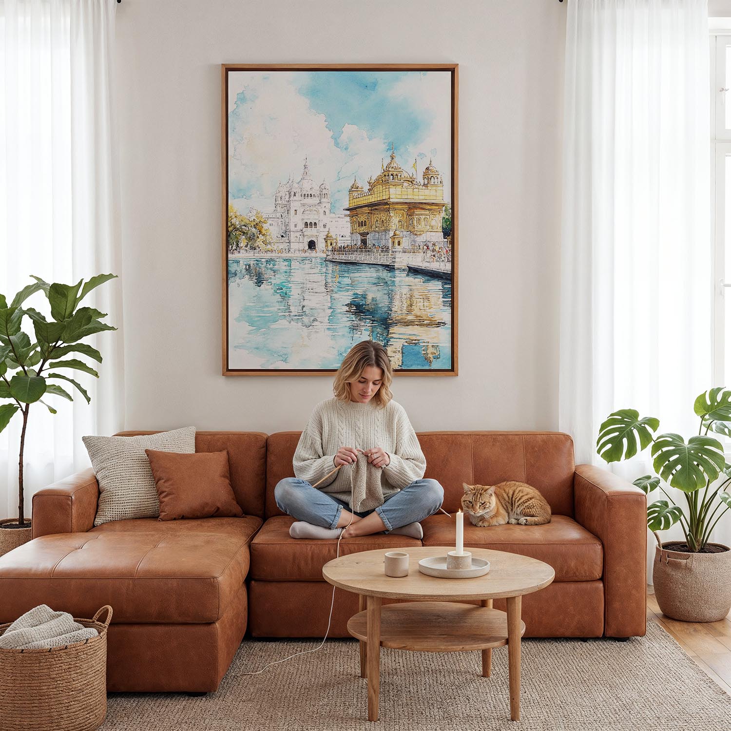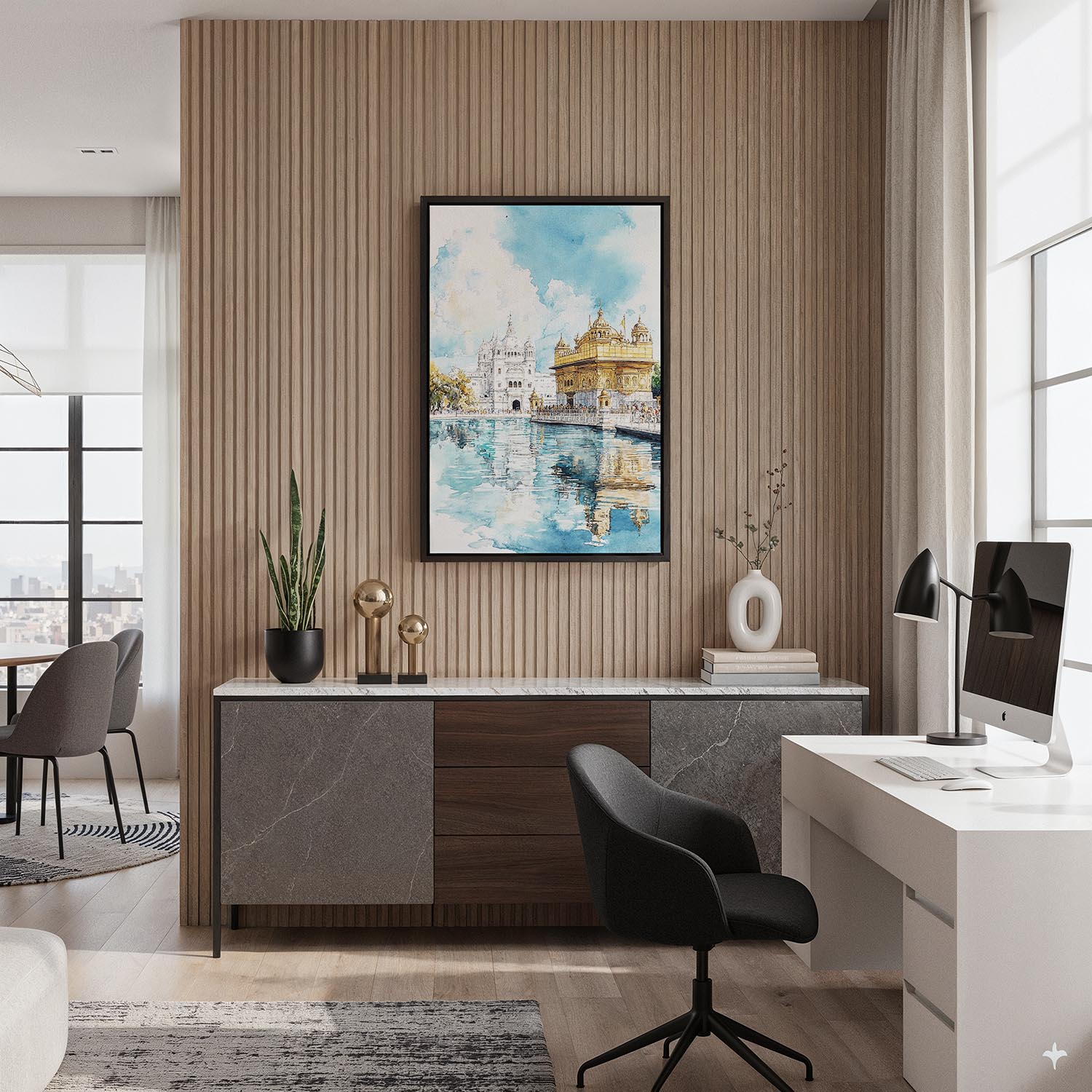 Bring the serene beauty of Amritsar’s Golden Temple into your space with this watercolor canvas print. Perfect for any room, it’s ready to hang and adds a touch of culture to your decor.