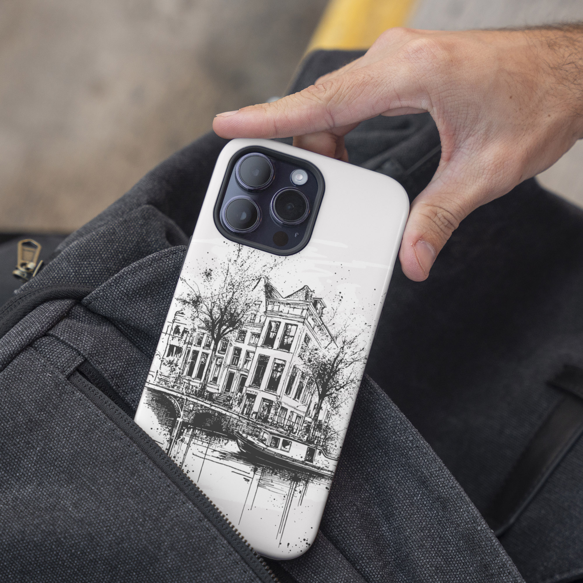 Embrace the charm of Amsterdam with this phone case adorned with a detailed pencil drawing of iconic canal houses. Sleek and durable, it seamlessly fits into your daily routine.