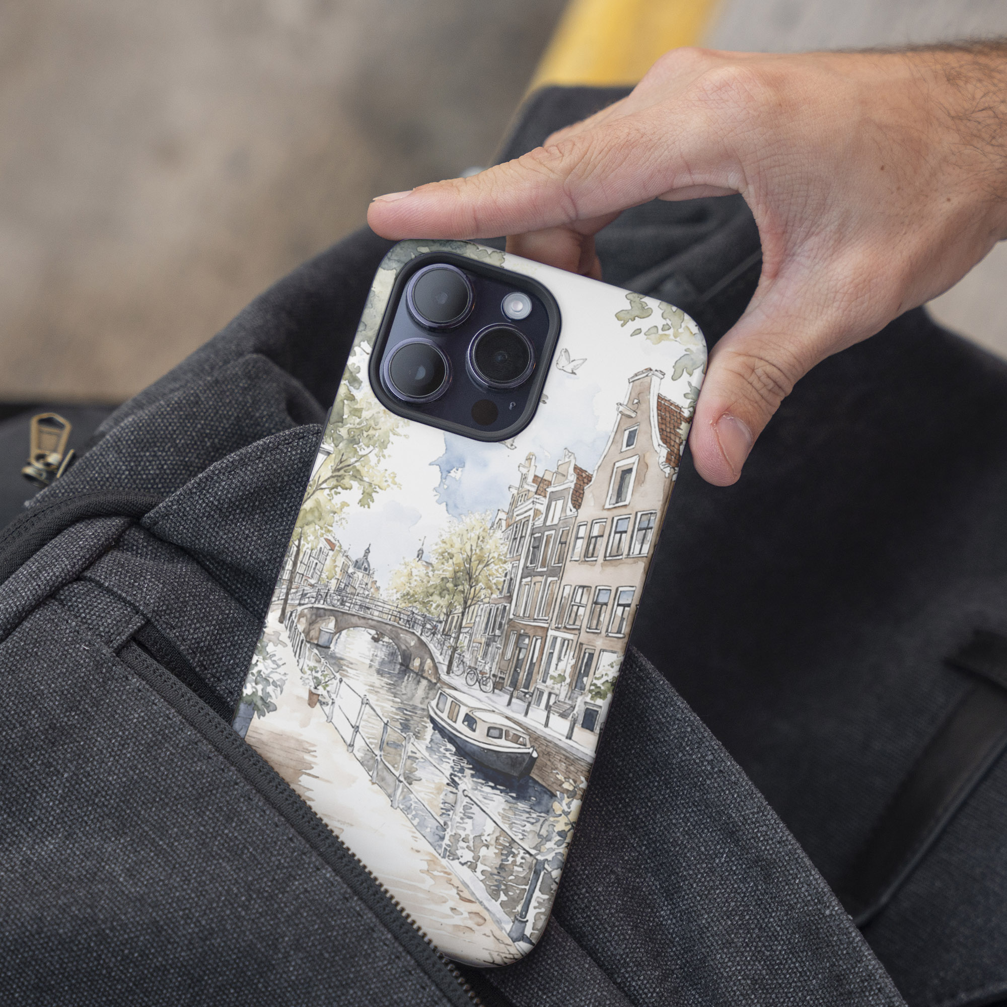 Amsterdam Watercolor Phone Case – Charming Canal Scene Art Cover for Travel Enthusiasts