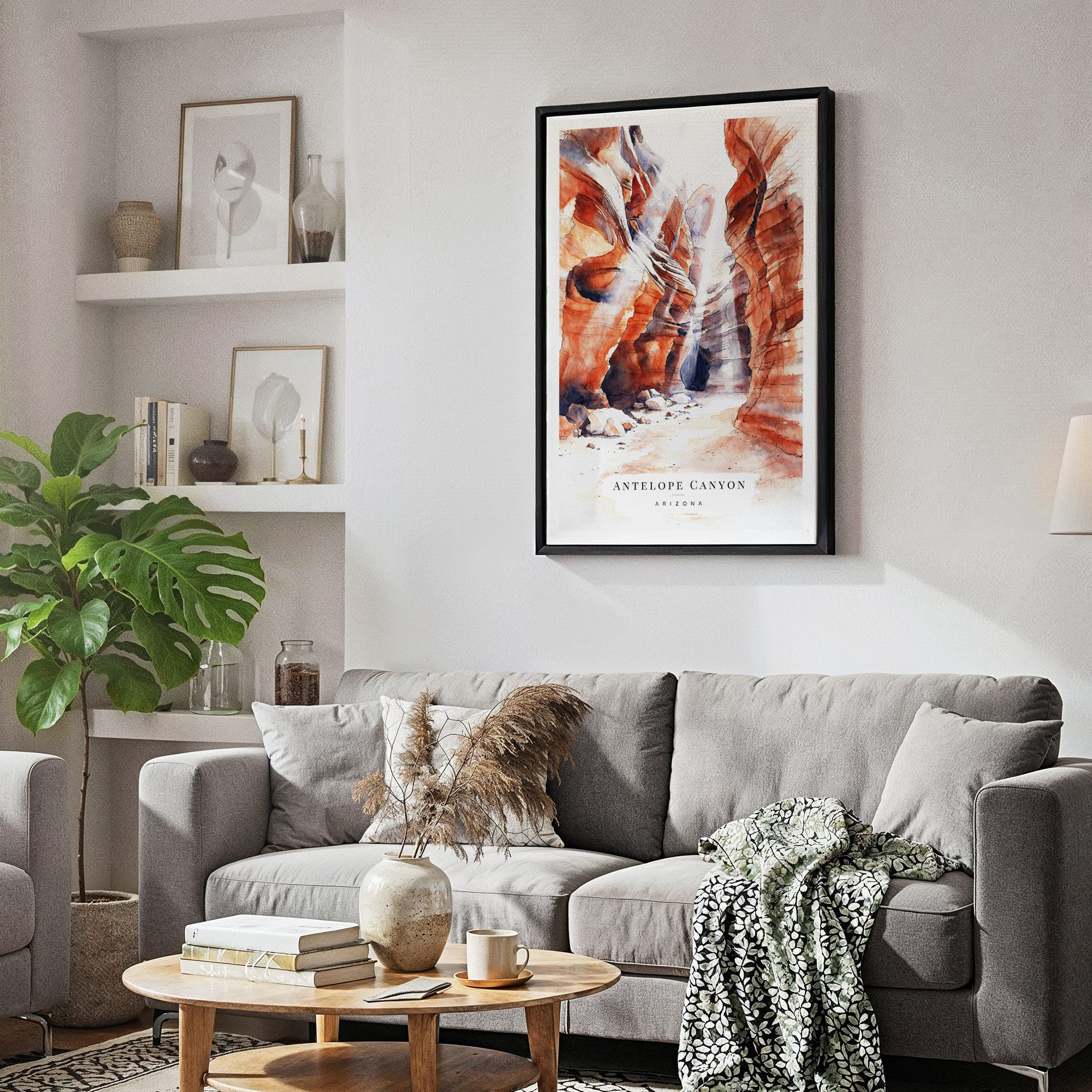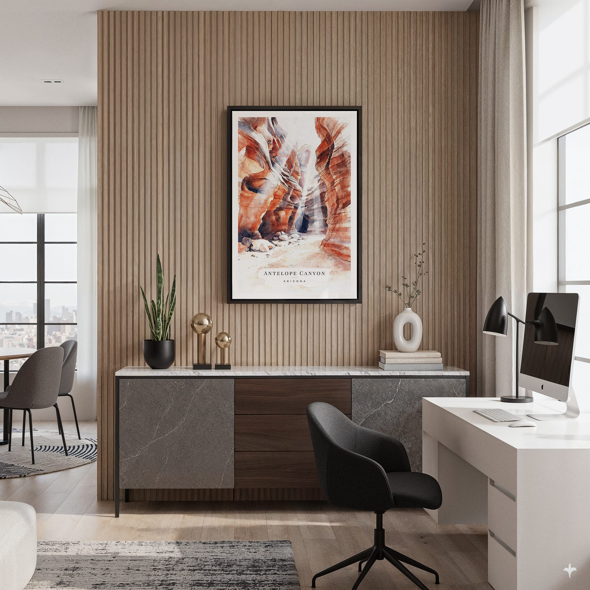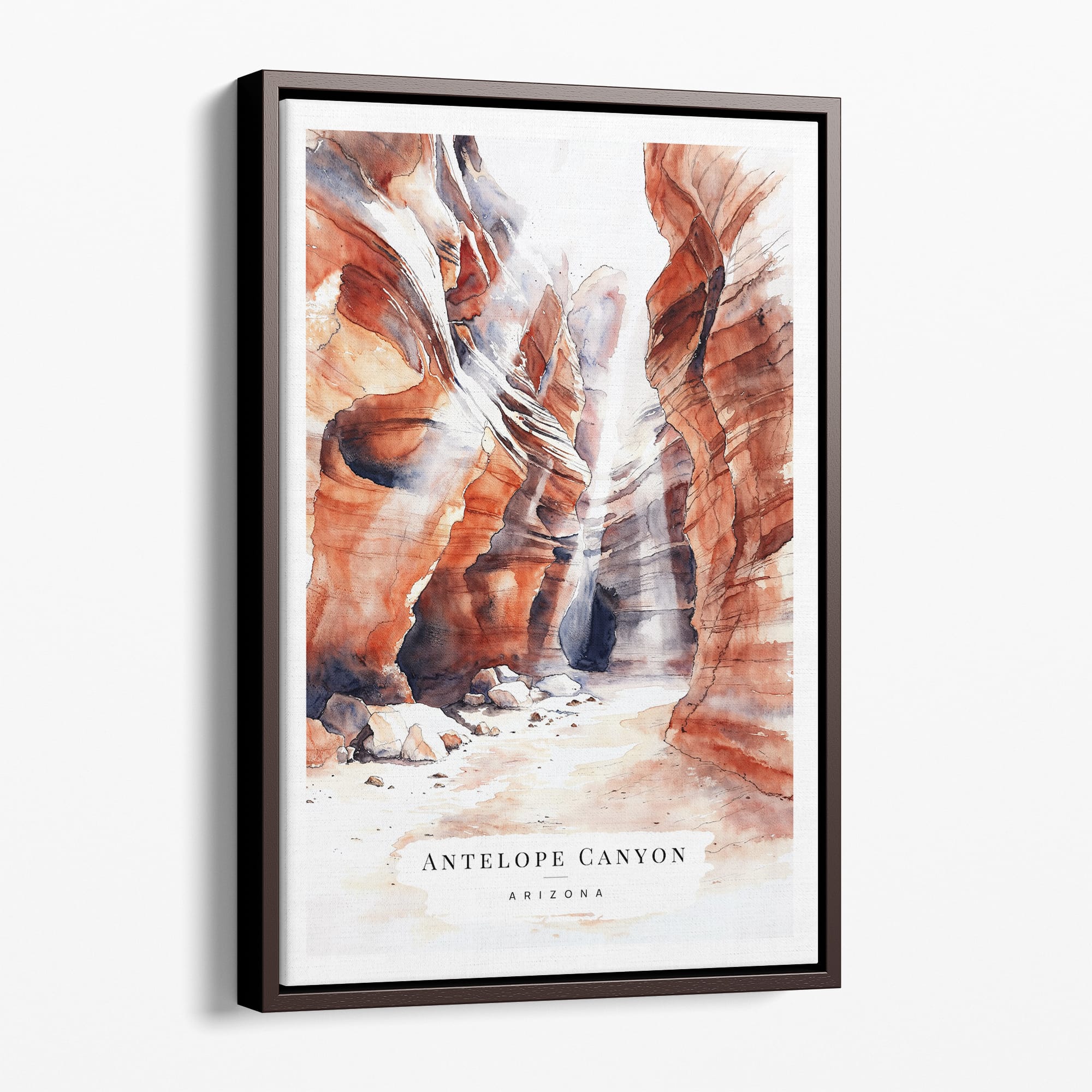 This artwork captures the breathtaking beauty of Antelope Canyon, showcasing rich reds and natural light filtering through the canyon walls. The watercolor style creates a warm, inviting feel, making it a wonderful addition to your living room, office, or bedroom. Printed on quality canvas with fade-resistant inks, it arrives ready to hang, adding a personal touch to your space or serving as a memorable gift for those who appreciate nature’s wonders.