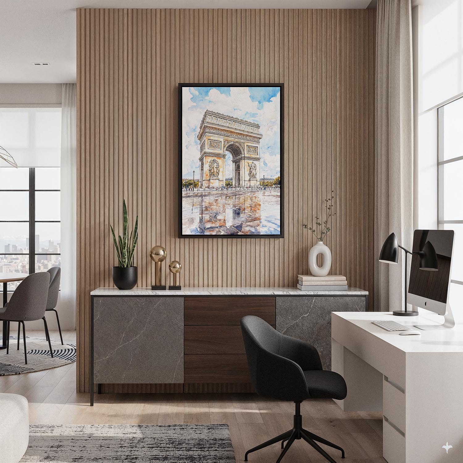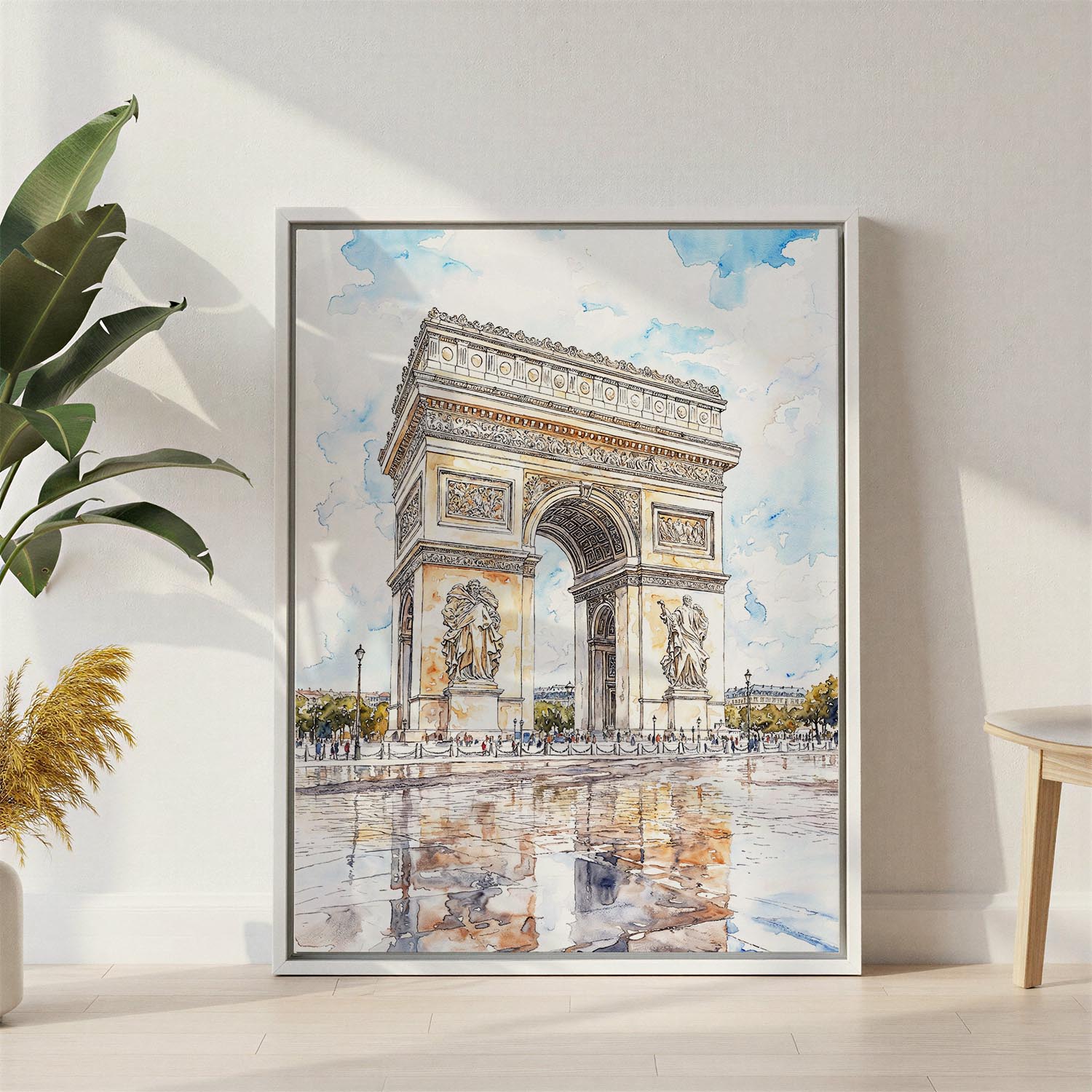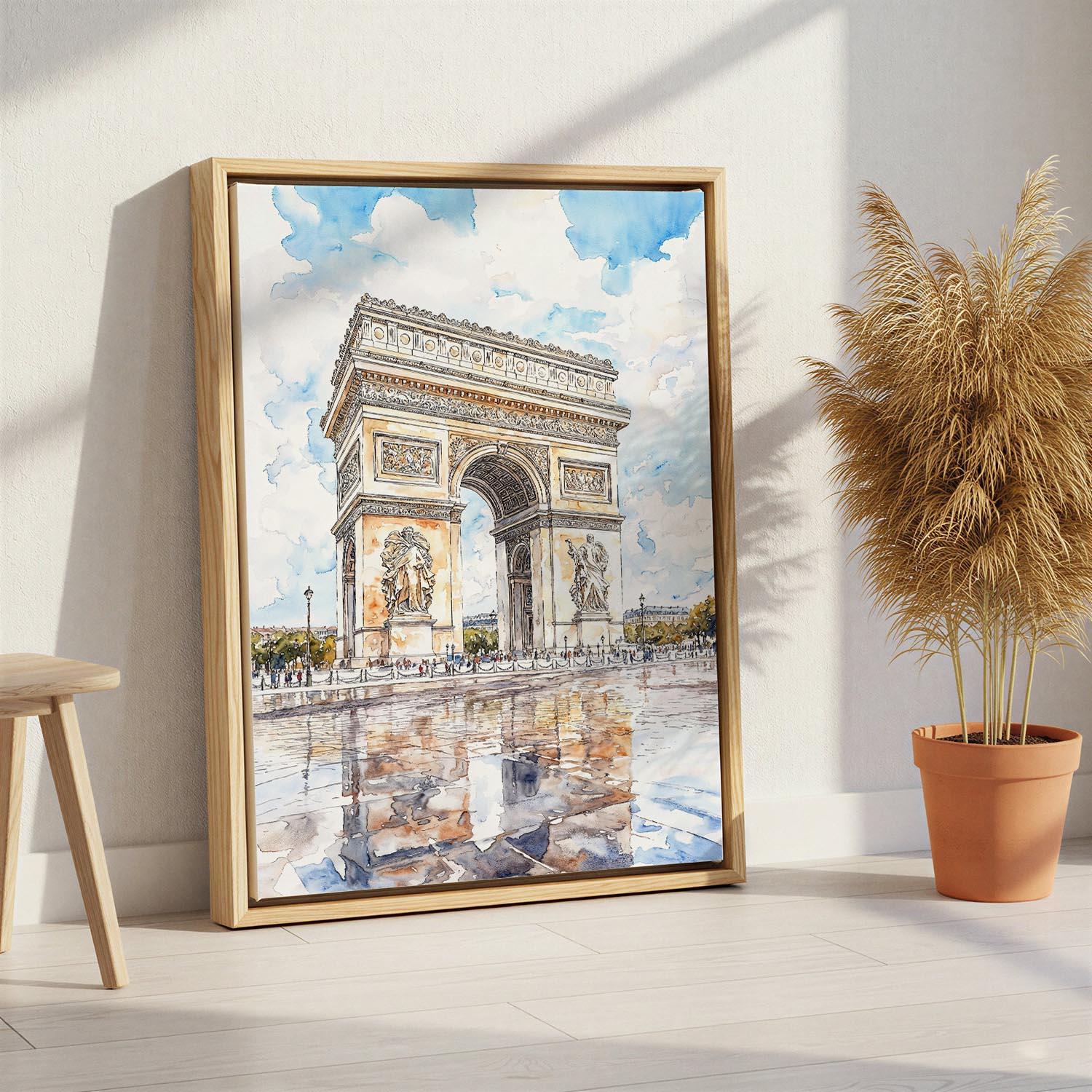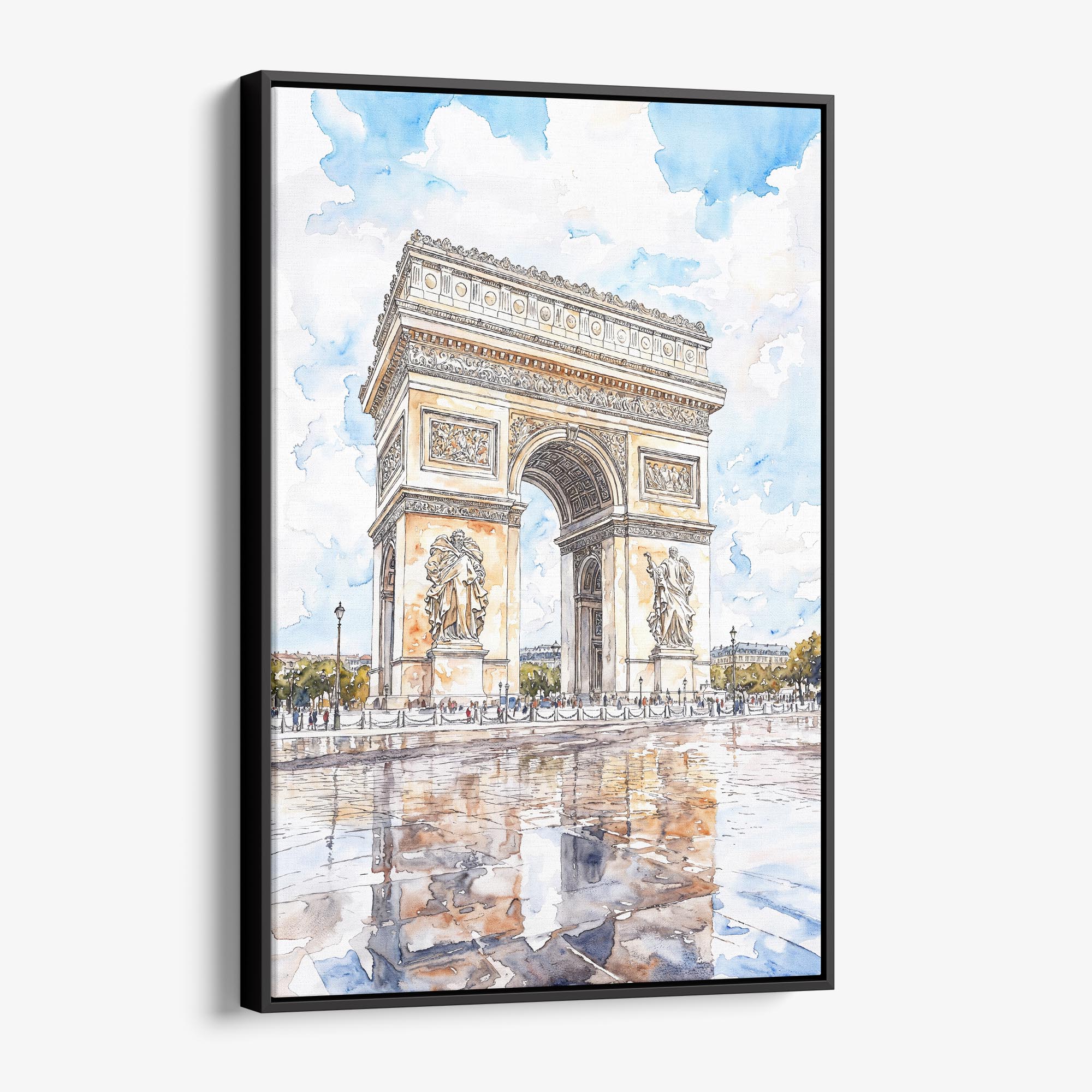 Step into the heart of Paris with this beautifully detailed watercolor canvas print of the iconic Arc de Triomphe. This artwork captures the majestic arch and its reflections, inviting viewers to appreciate its grandeur. Available in various finishes, including unframed and with a floater frame, it’s crafted on hand-stretched canvas with solid wood stretcher bars, ensuring durability and fade resistance.