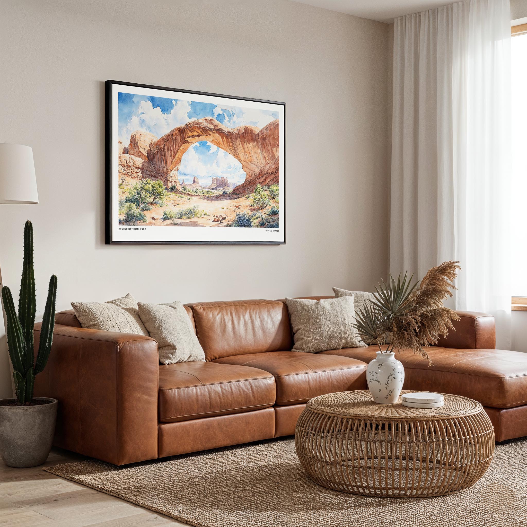 Capture the expansive beauty of Arches National Park with this watercolor canvas print. The artwork showcases iconic rock formations and sweeping skies, inviting a sense of adventure into your space. Crafted on high-quality, hand-stretched canvas with fade-resistant inks, it’s ready to hang and adds warmth to any room, whether it’s a living room, office, or hallway. A thoughtful piece for art lovers and nature enthusiasts alike.