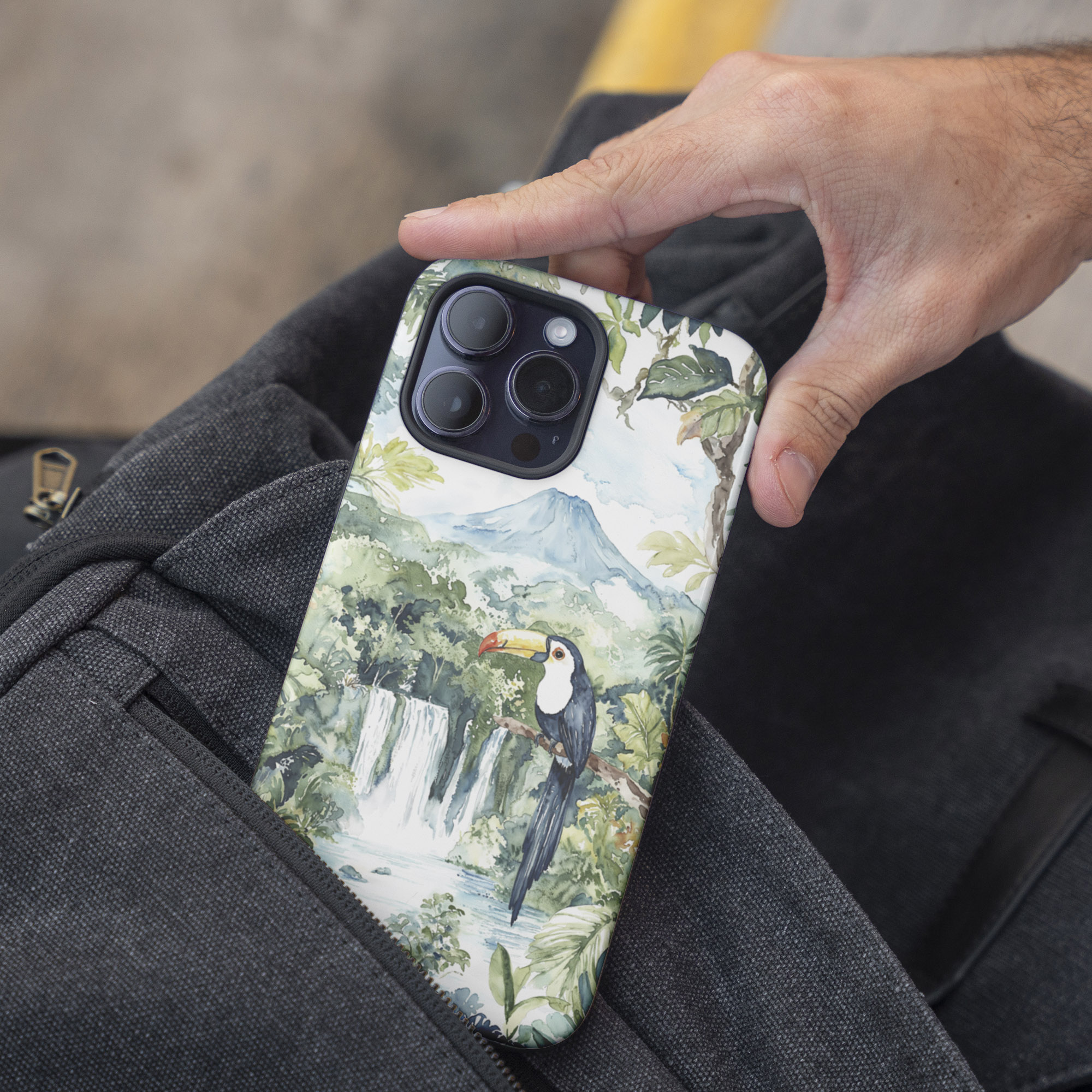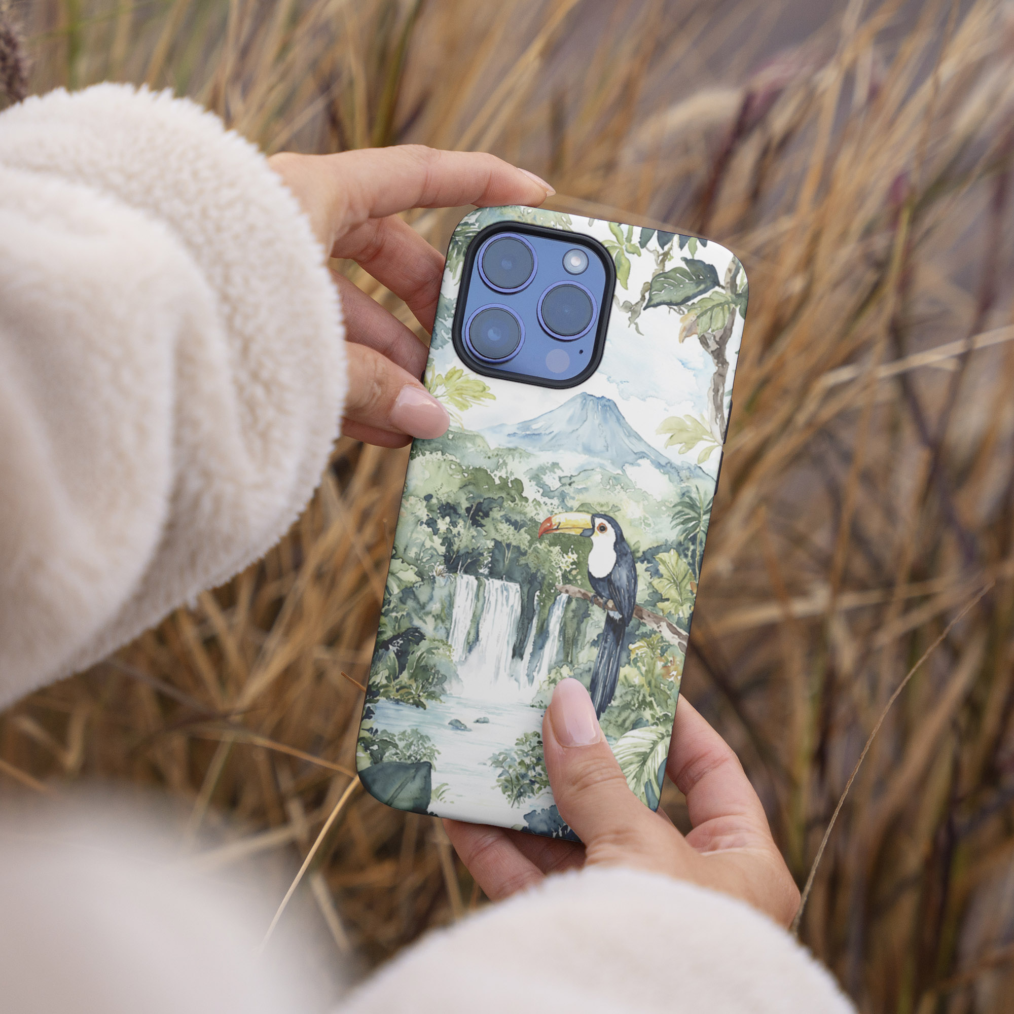 This Arenal Volcano phone case brings the beauty of tropical Costa Rica to your everyday life. Featuring a vibrant toucan amidst lush greenery and cascading waterfalls, it’s both practical and eye-catching.