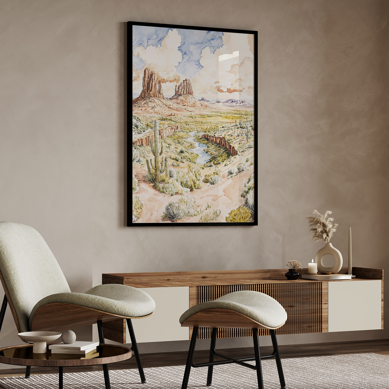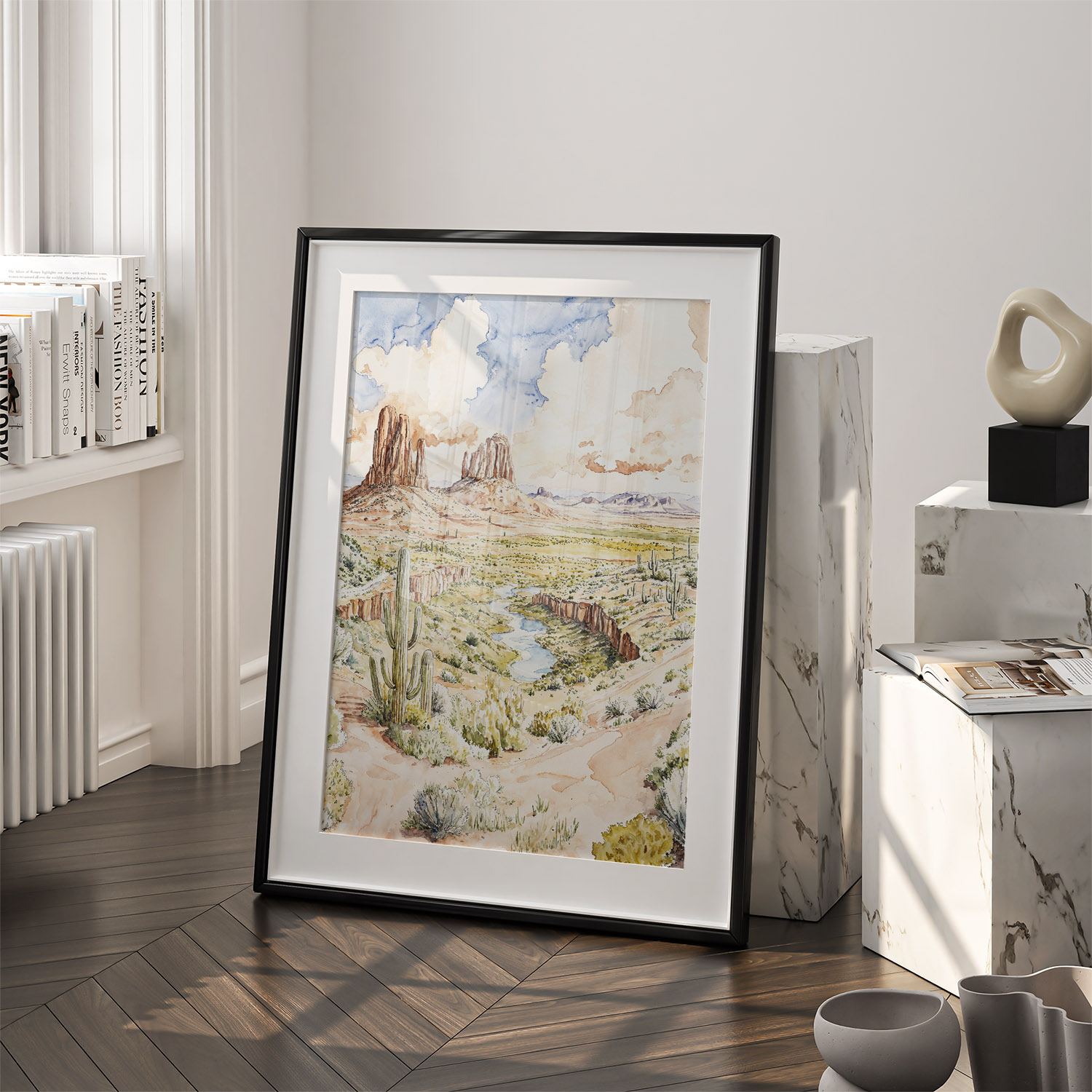 Bring the beauty of the Arizona desert into your home with this watercolor landscape wall art. Enjoy instant access to a printable file, allowing for easy printing at home or through a local shop.