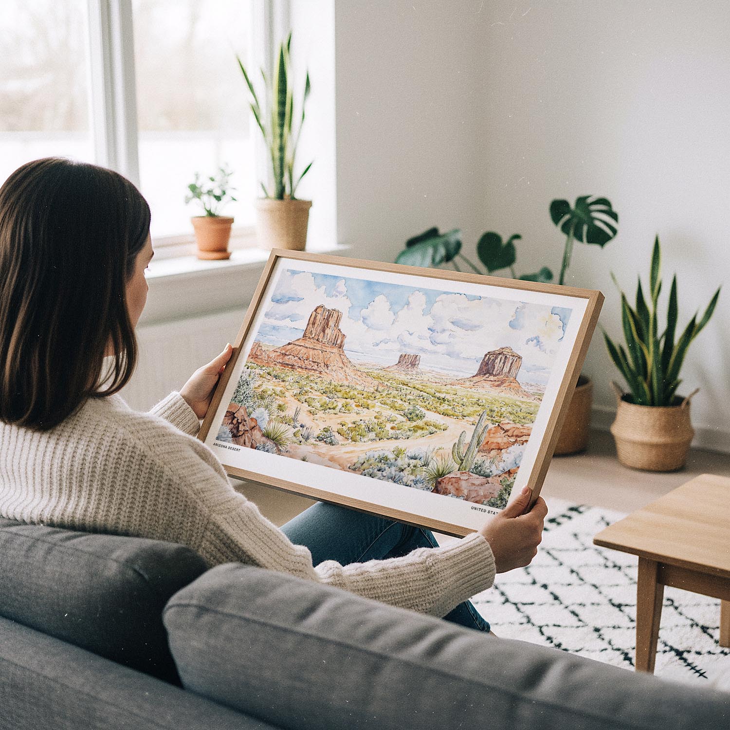 Capture the essence of the Arizona desert with this watercolor art print. Featuring iconic mesas and lush cacti, it’s a wonderful addition for those who cherish travel memories.