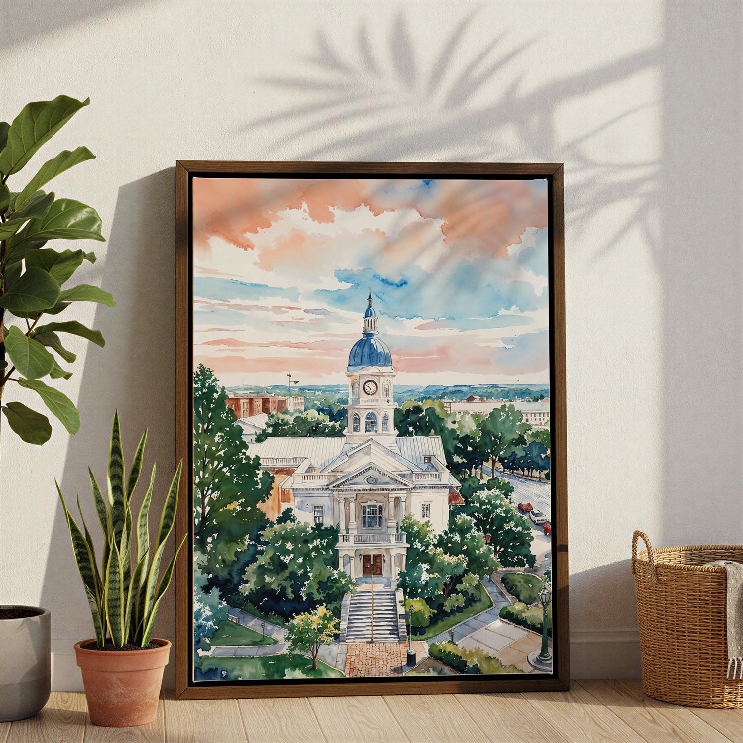 This watercolor print beautifully illustrates the historic courthouse in Athens, Georgia, framed by vibrant greenery and a colorful sky. The scene emanates a sense of community and connection, inviting the viewer to imagine the stories held within its walls.