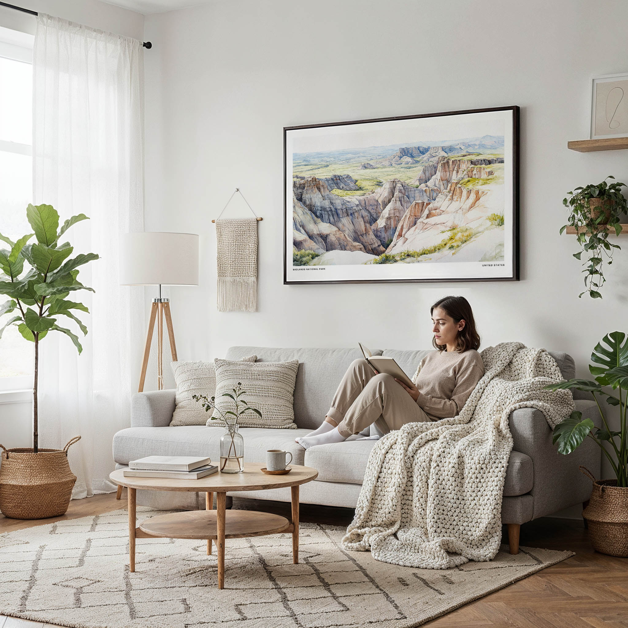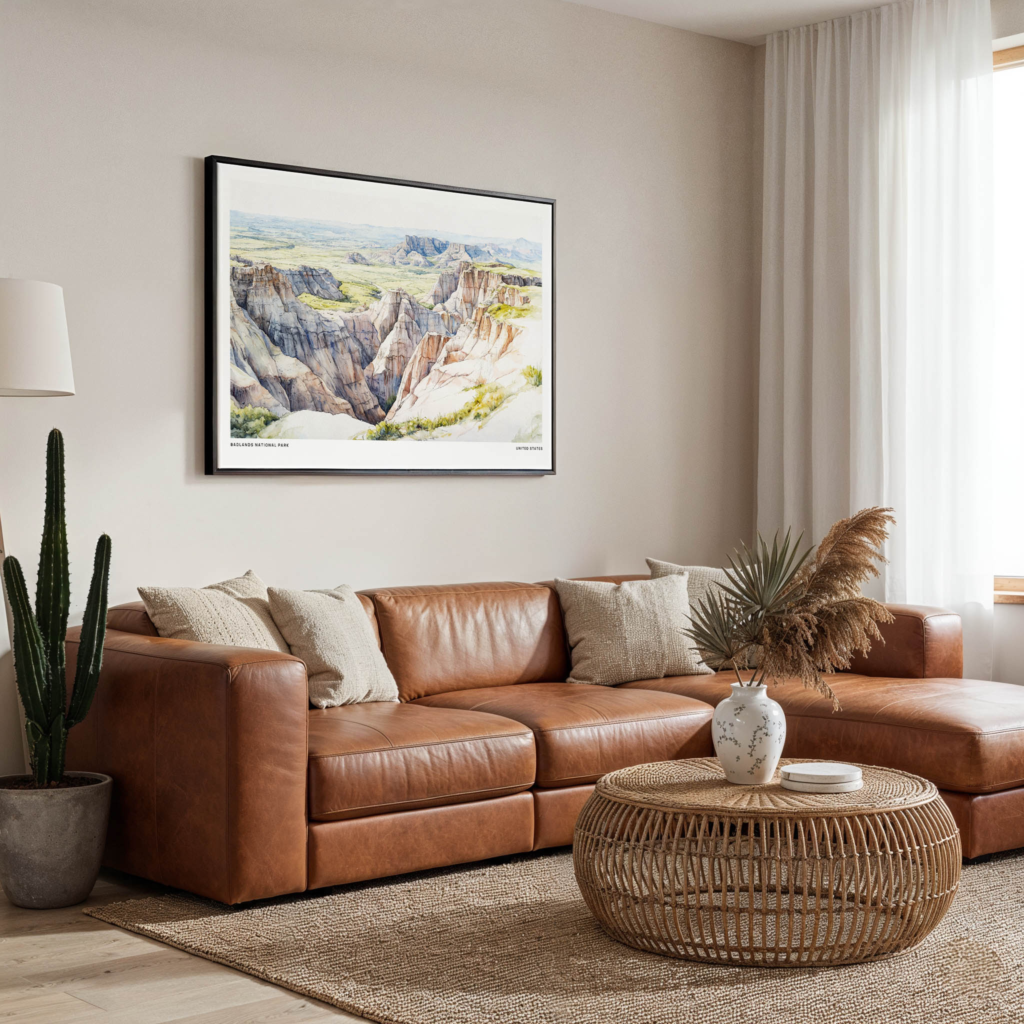 This canvas print captures the unique formations and expansive views of Badlands National Park through delicate watercolor tones. The artwork infuses any room with a sense of adventure and tranquility, making it ideal for living rooms, offices, or hallways. Crafted with a sturdy wood frame and fade-resistant inks, it’s ready to hang. Enjoy it as a personal piece or share it as a thoughtful gift for nature lovers and explorers.