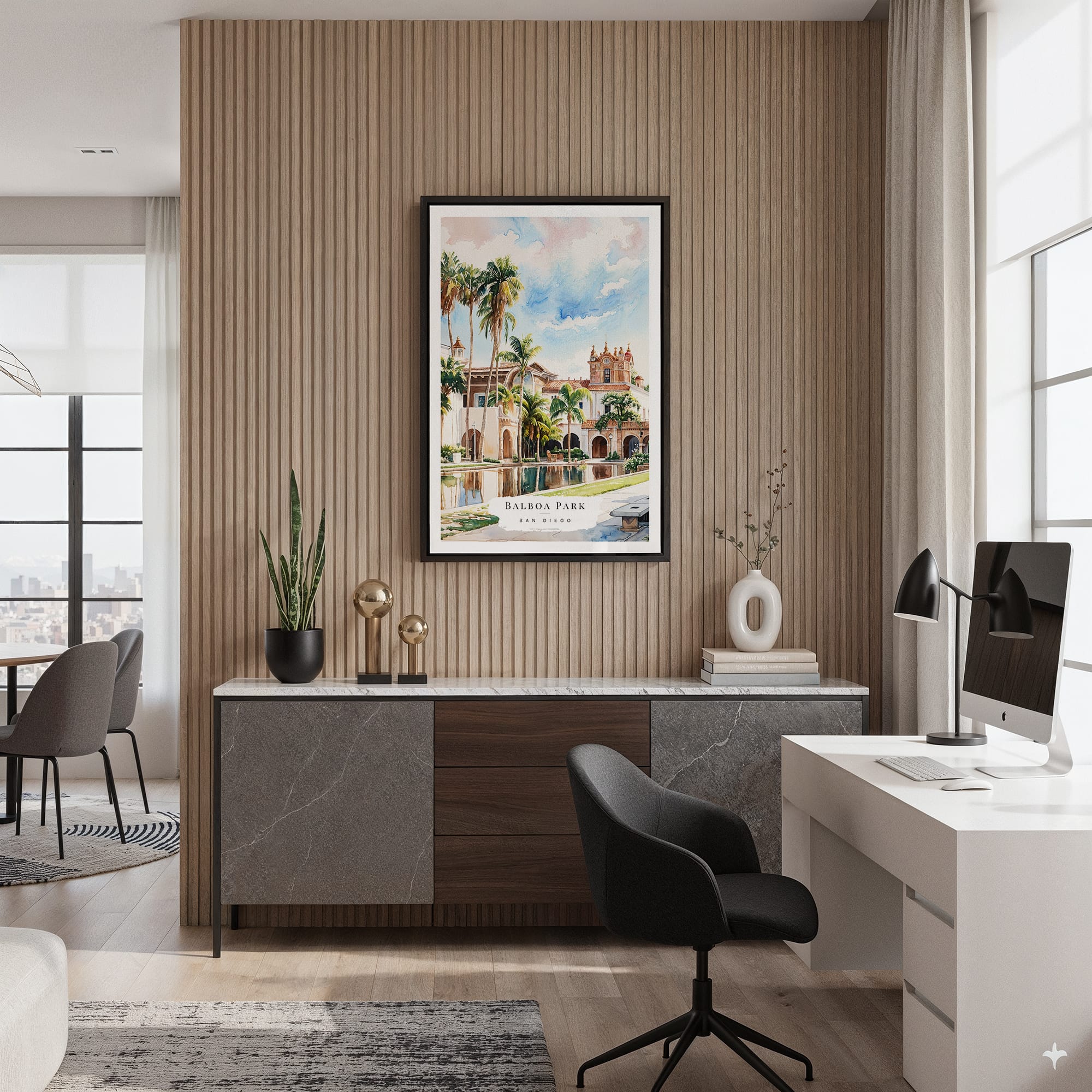 This piece showcases the charm of Balboa Park with its vibrant colors and lush palm trees, capturing a serene San Diego vibe. The warm hues and gentle reflections create a relaxed atmosphere suitable for any living space. Crafted on high-quality canvas with fade-resistant inks, it arrives ready to hang. Ideal for your living room or office, this artwork makes both a personal treasure and a delightful gift for art lovers.