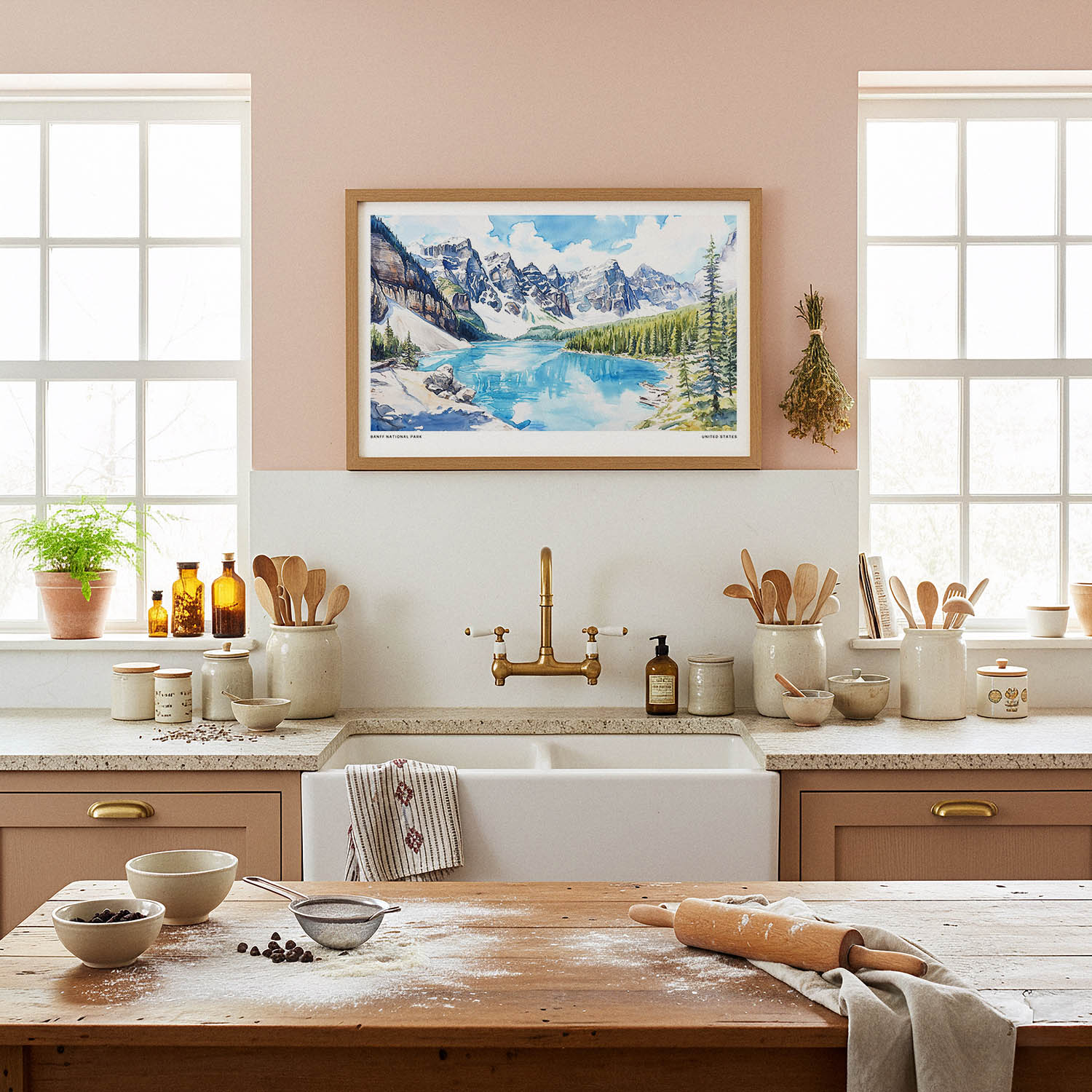 Capture the breathtaking beauty of Banff National Park with this watercolor art print. Featuring turquoise waters and towering peaks, it’s ideal for nature enthusiasts and a lovely addition to any home.