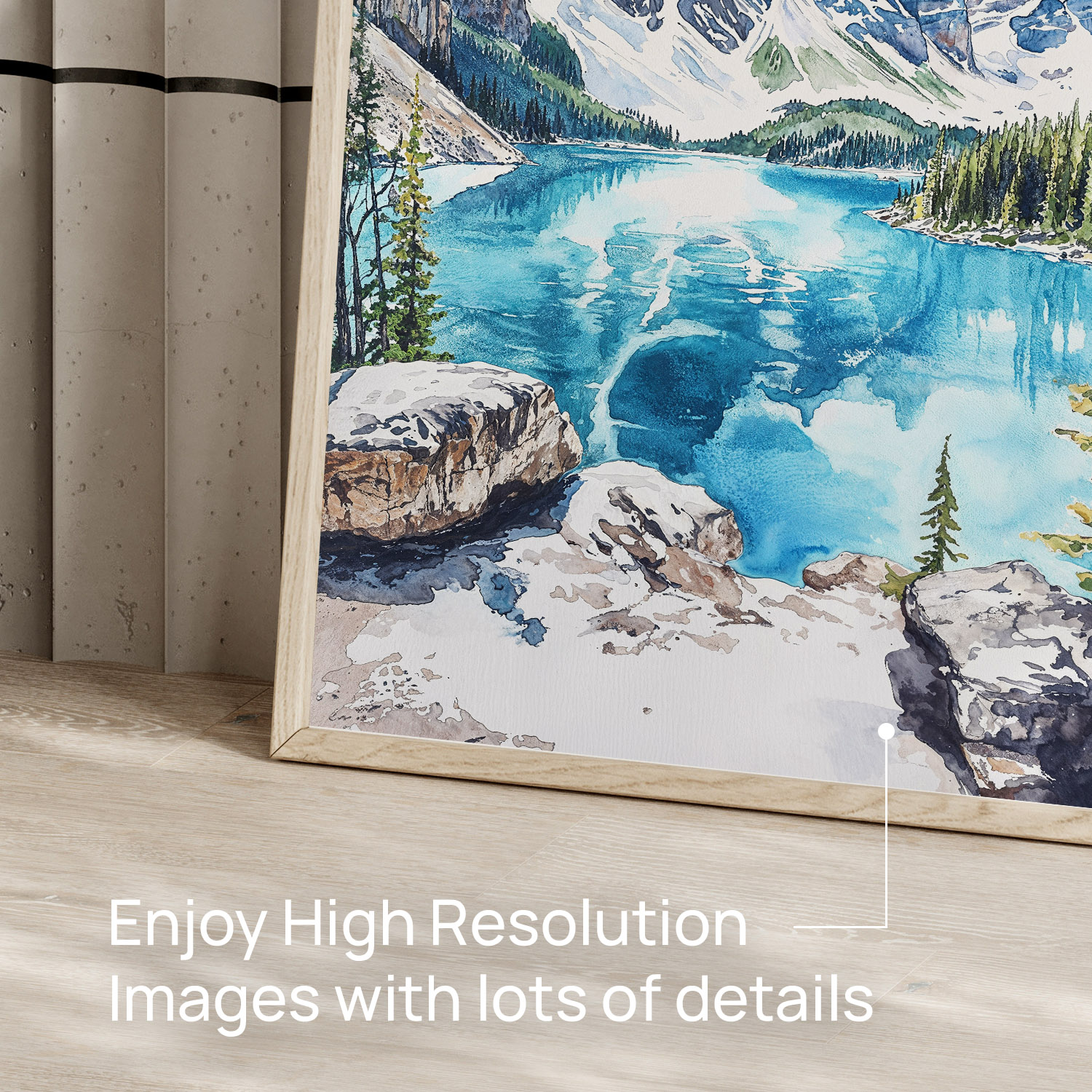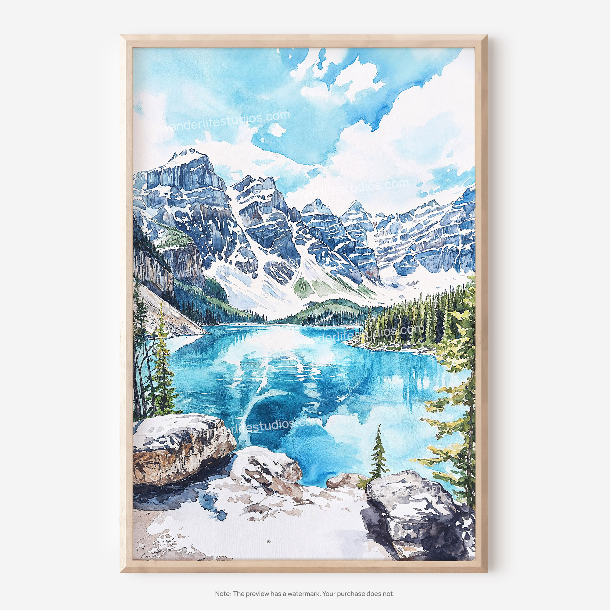 Transform your space with this Banff National Park watercolor wall art. Featuring vibrant blues and mountain landscapes, this digital download offers instant access for easy printing, making it simple to enjoy stunning nature views at home.