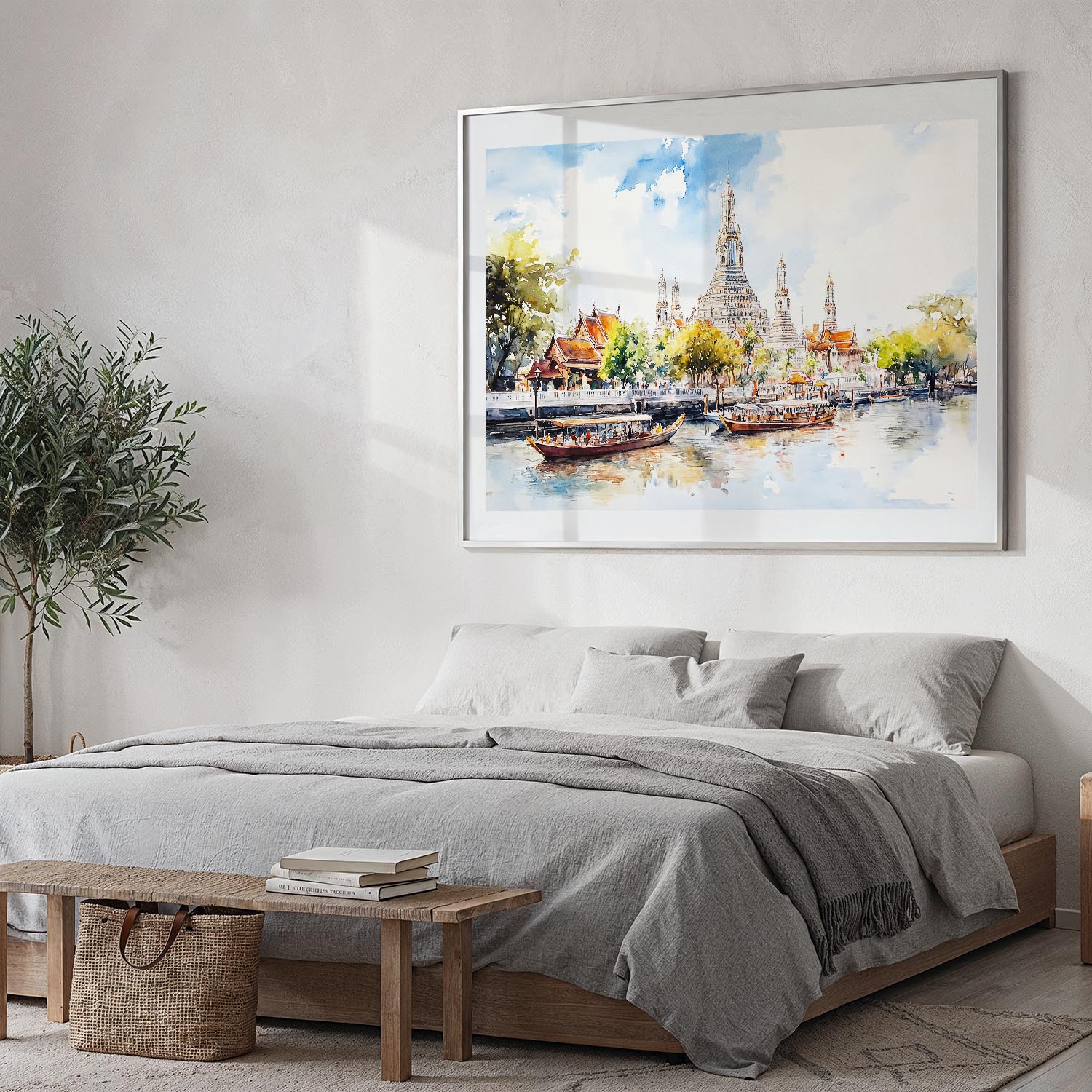 Experience the beauty of Bangkok’s Wat Arun, a stunning architectural gem that rises gracefully along the river. This watercolor painting captures the temple’s exquisite details, surrounded by lush greenery and the gentle flow of the water. The vibrant colors and soft brush strokes evoke a sense of tranquility and wonder.