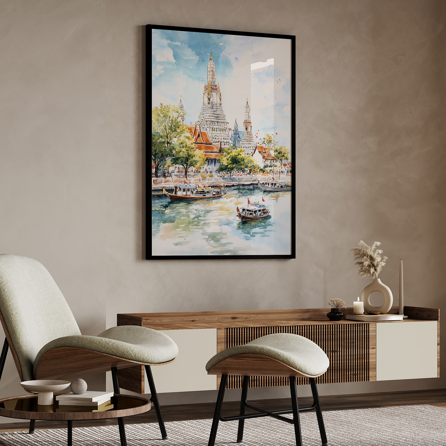 This artwork beautifully showcases the Wat Arun temple in Bangkok, featuring vibrant colors and intricate details that bring the scene to life. It offers a warm and inviting feel, perfect for evoking memories of travel or simply enhancing your living space. Delivered as a high-resolution digital file, it’s easy to print at home or with a local service. Whether in a living room, bedroom, or office, this piece adds a touch of elegance and ease, inviting instant enjoyment.