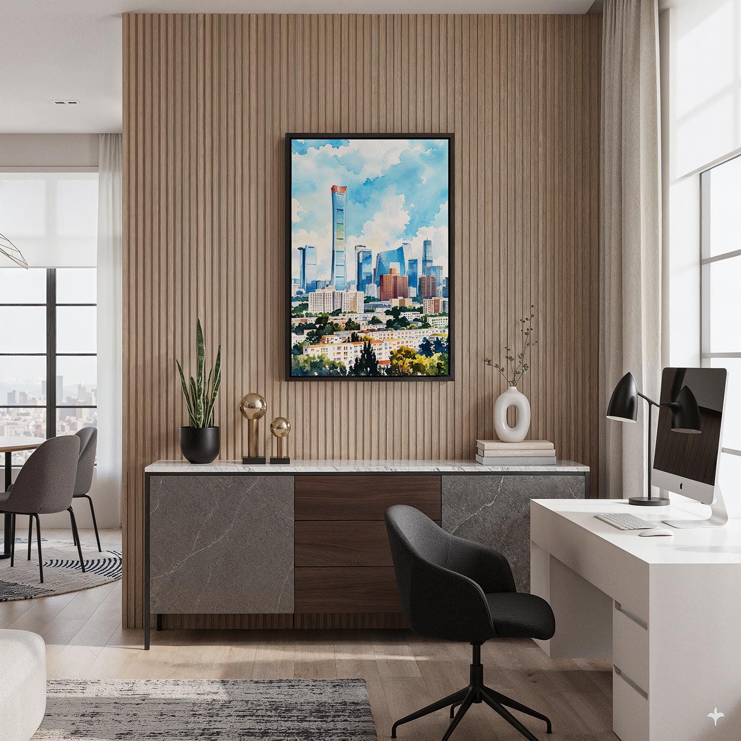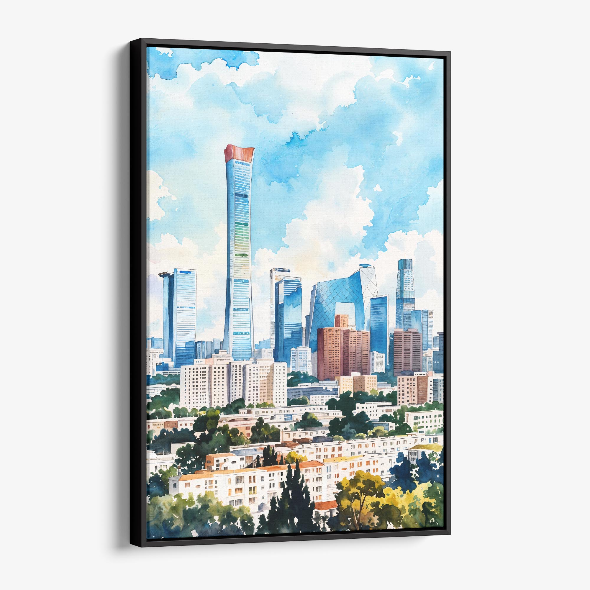 Experience the essence of Beijing with this stunning watercolor canvas print. It captures the dynamic skyline with soft hues and bold shapes, showcasing modern architecture against a bright sky.