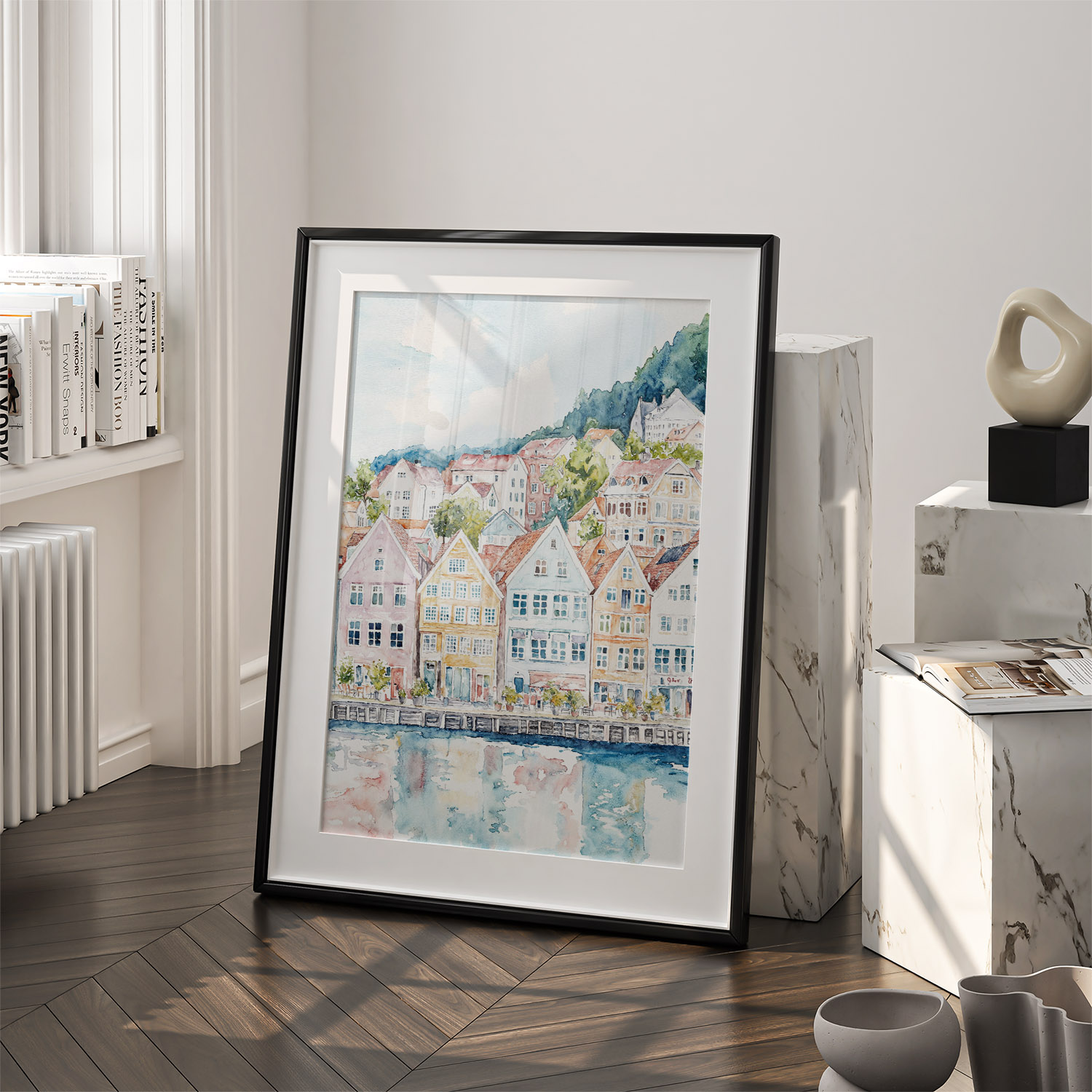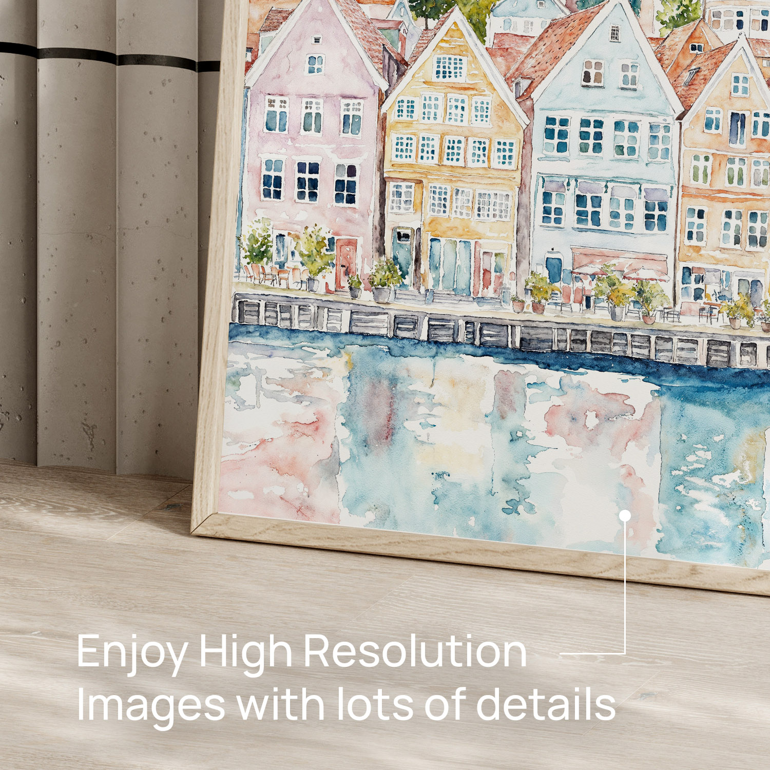 Capture the charm of Bergen with this watercolor digital download wall art. Its colorful houses reflected in the water create a warm, inviting atmosphere, perfect for easy printing at home or your local print shop.
