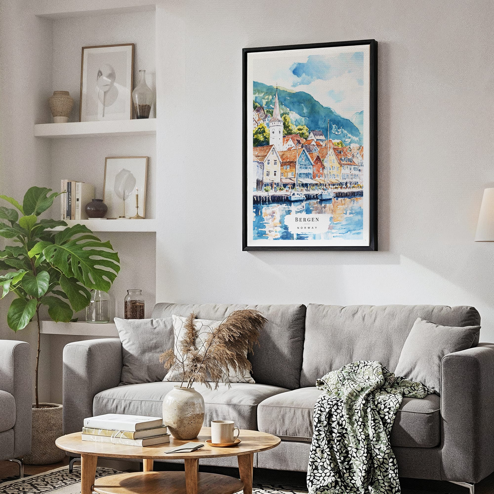 This canvas art print captures the quaint beauty of Bergen, showcasing its colorful coastal buildings reflected in calm waters. With soothing hues of blue and orange, it creates a warm atmosphere in any room. Printed on durable canvas with fade-resistant inks, it arrives ready to hang, making it an excellent choice for homes, offices, or as a thoughtful gift for travel enthusiasts.