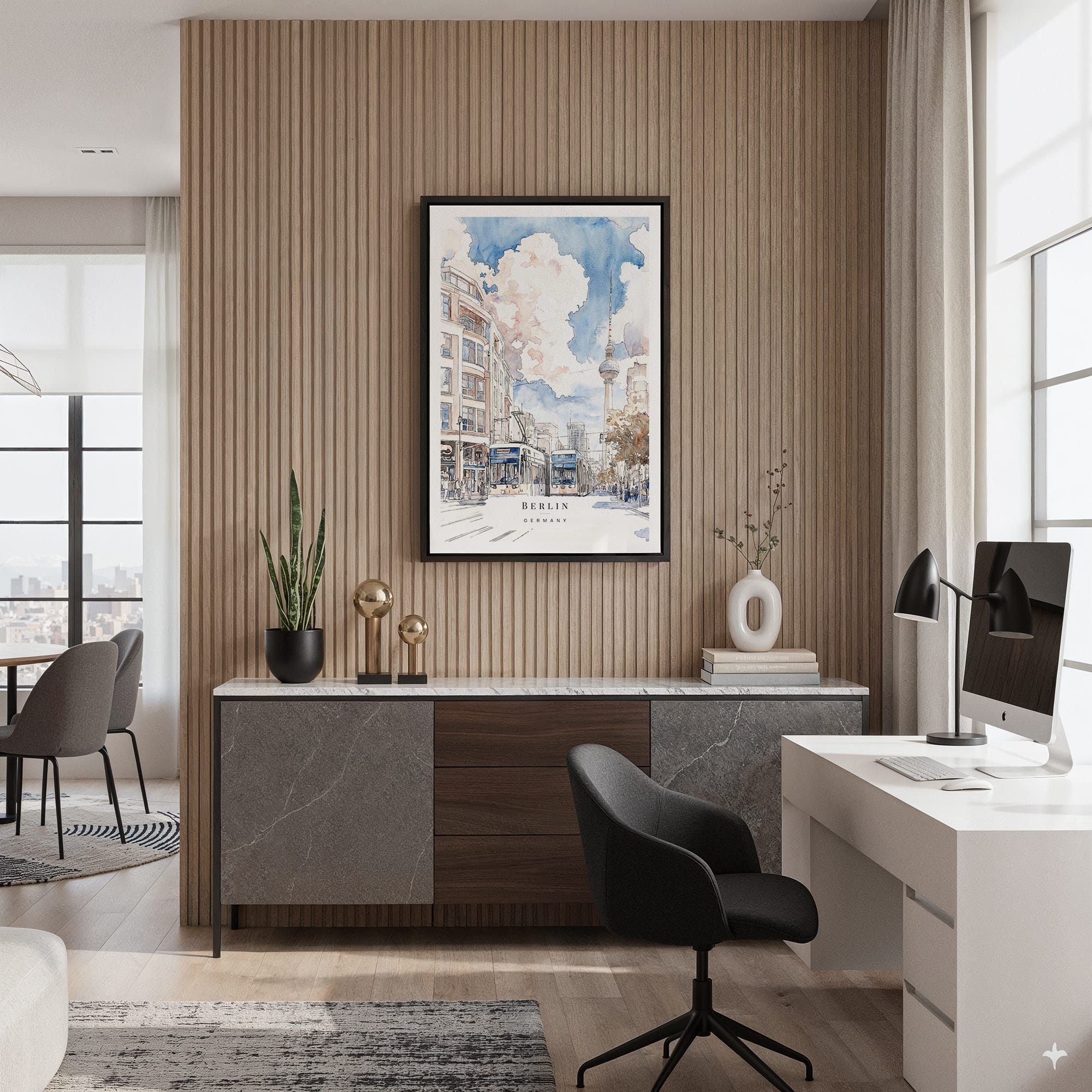 This Berlin watercolor canvas art print brings city life to your walls with soft blues and warm earth tones. It’s an easy way to brighten up any room, perfect for homes or offices.