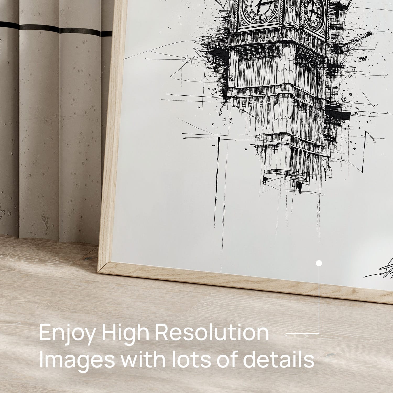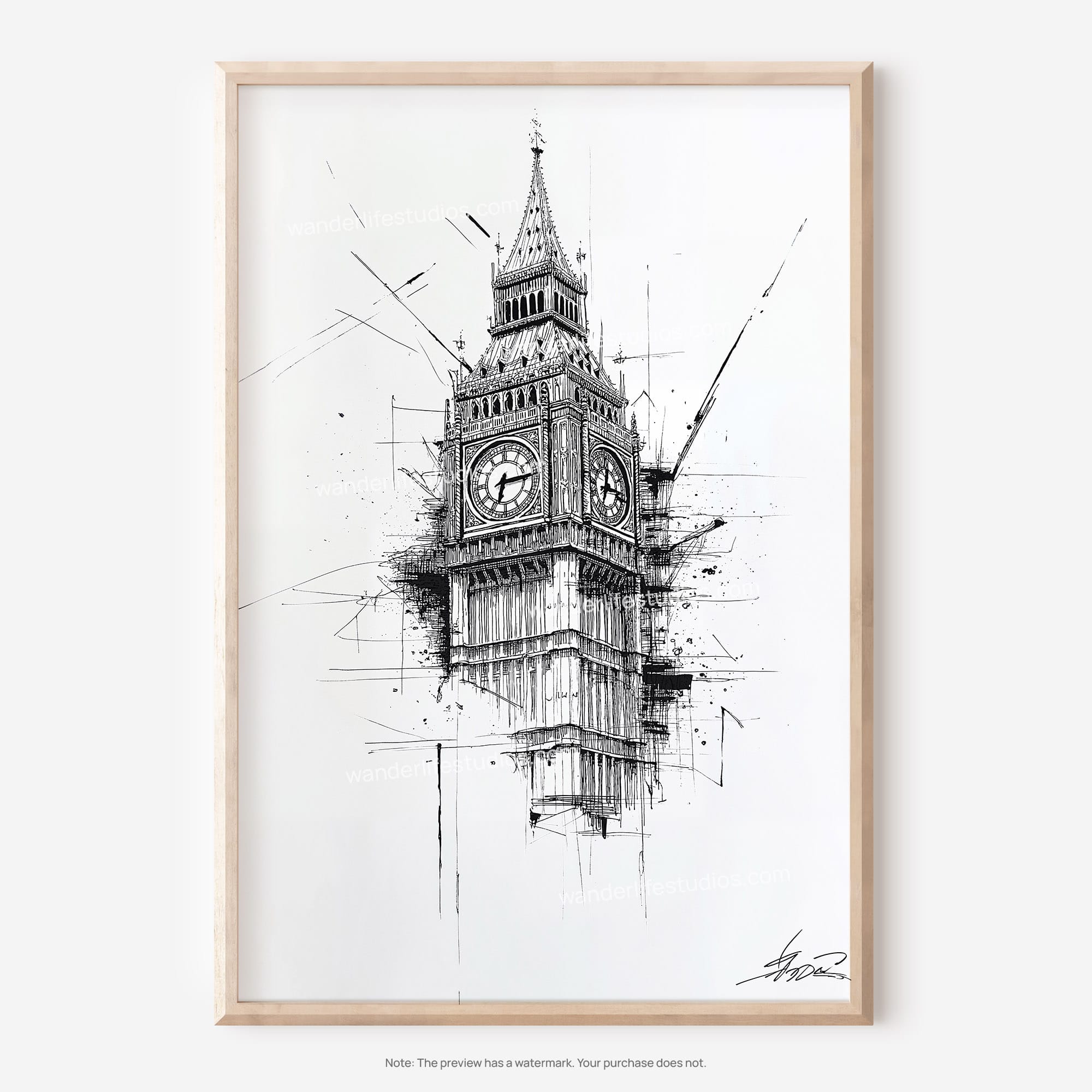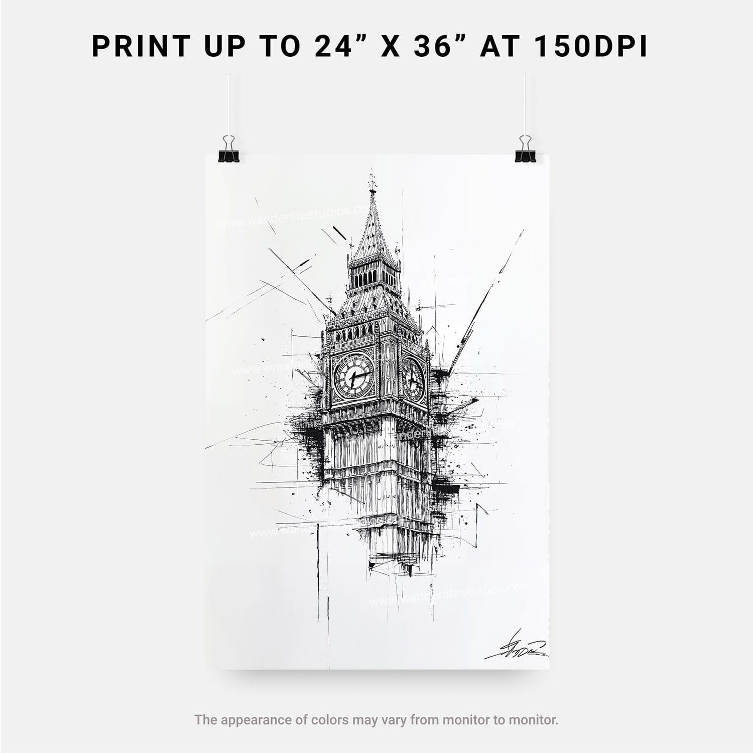 Elevate your space with this digital download wall art featuring a detailed pencil drawing of Big Ben. Enjoy the convenience of instant access to a high-resolution file, perfect for home printing or professional framing.