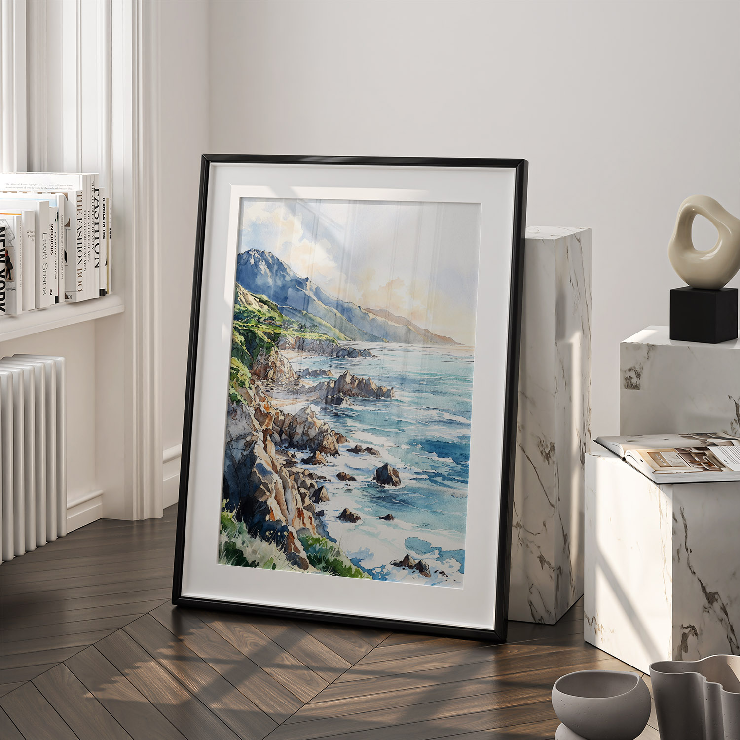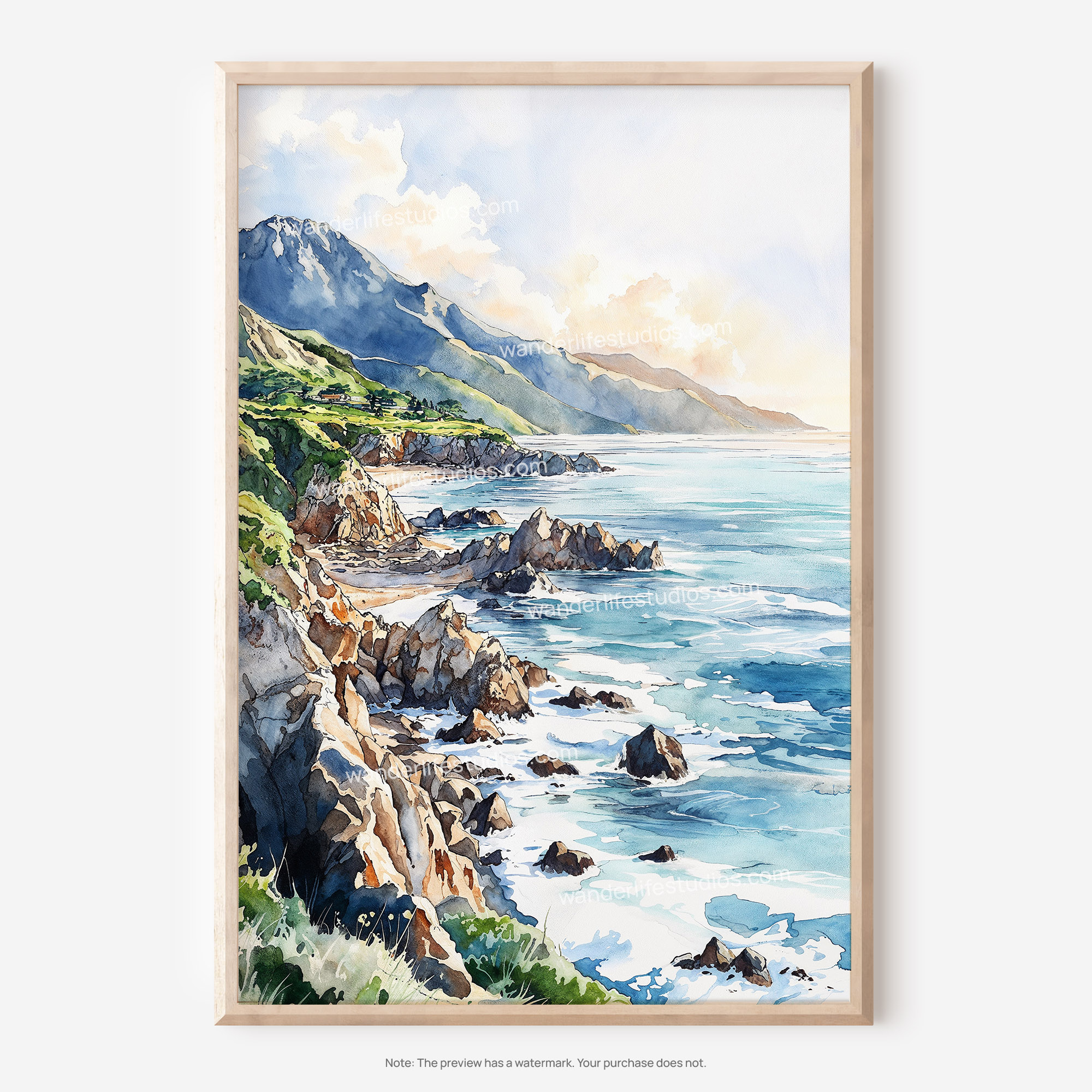 This digital download wall art showcases the breathtaking coastline of Big Sur in soft watercolor tones. Instantly accessible and ready for printing, it’s perfect for adding a touch of nature to any room.