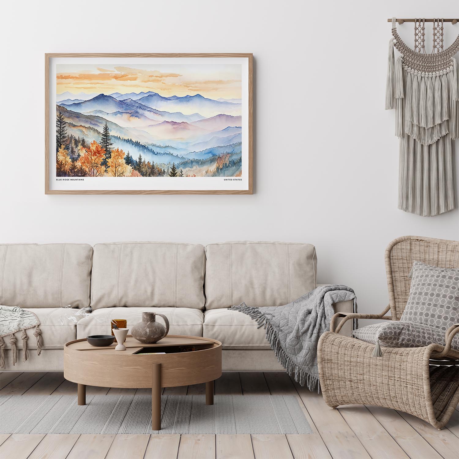 Bring the tranquil essence of the Blue Ridge Mountains into your home with this watercolor art print. Ideal for any space, it adds a warm touch to living rooms, bedrooms, or home offices.