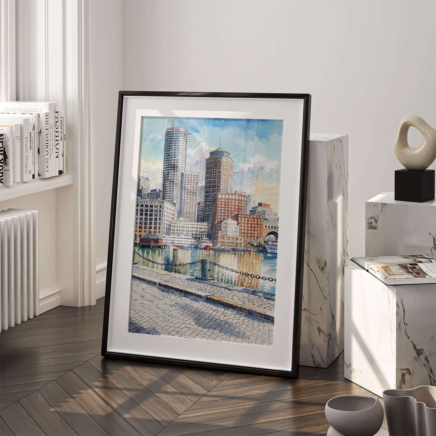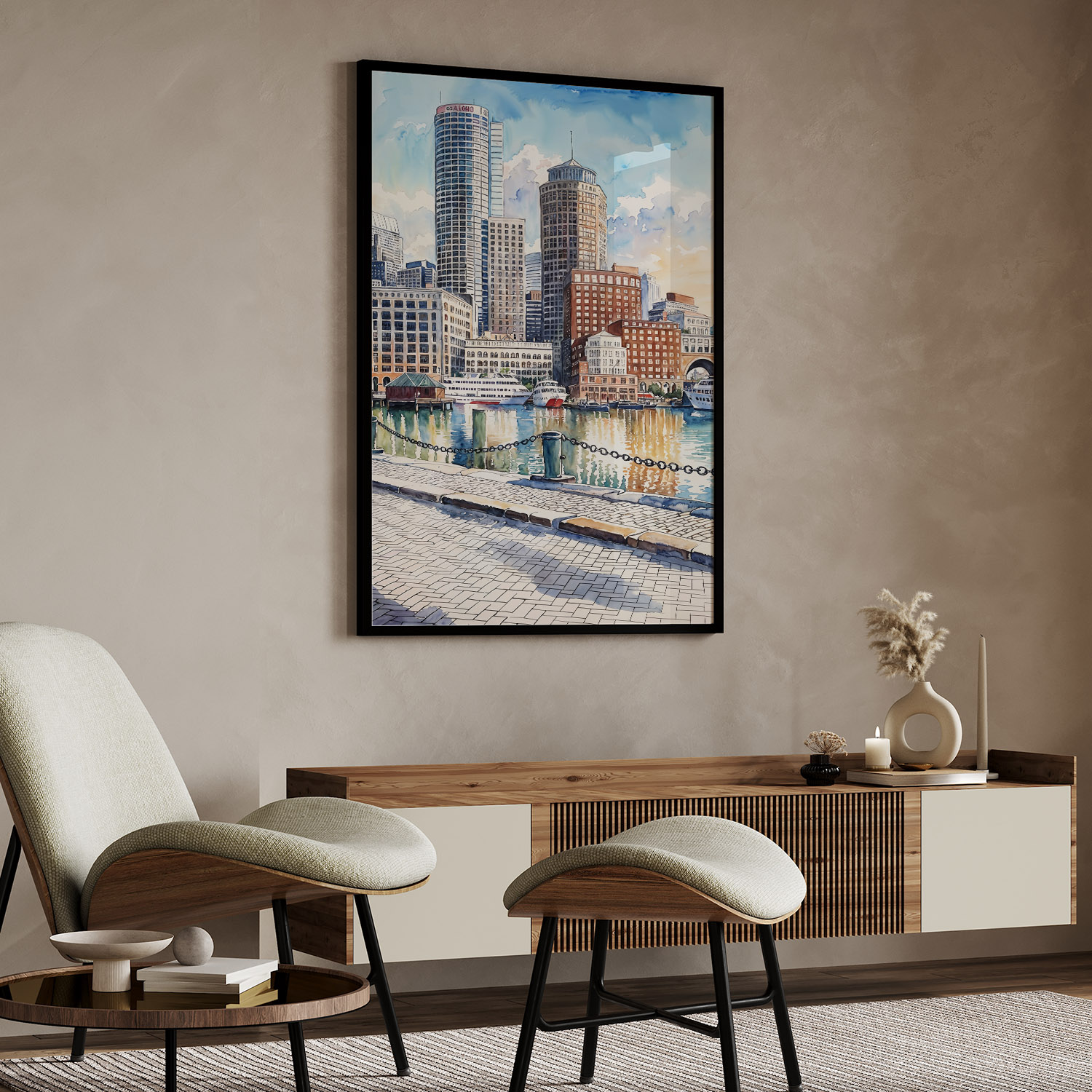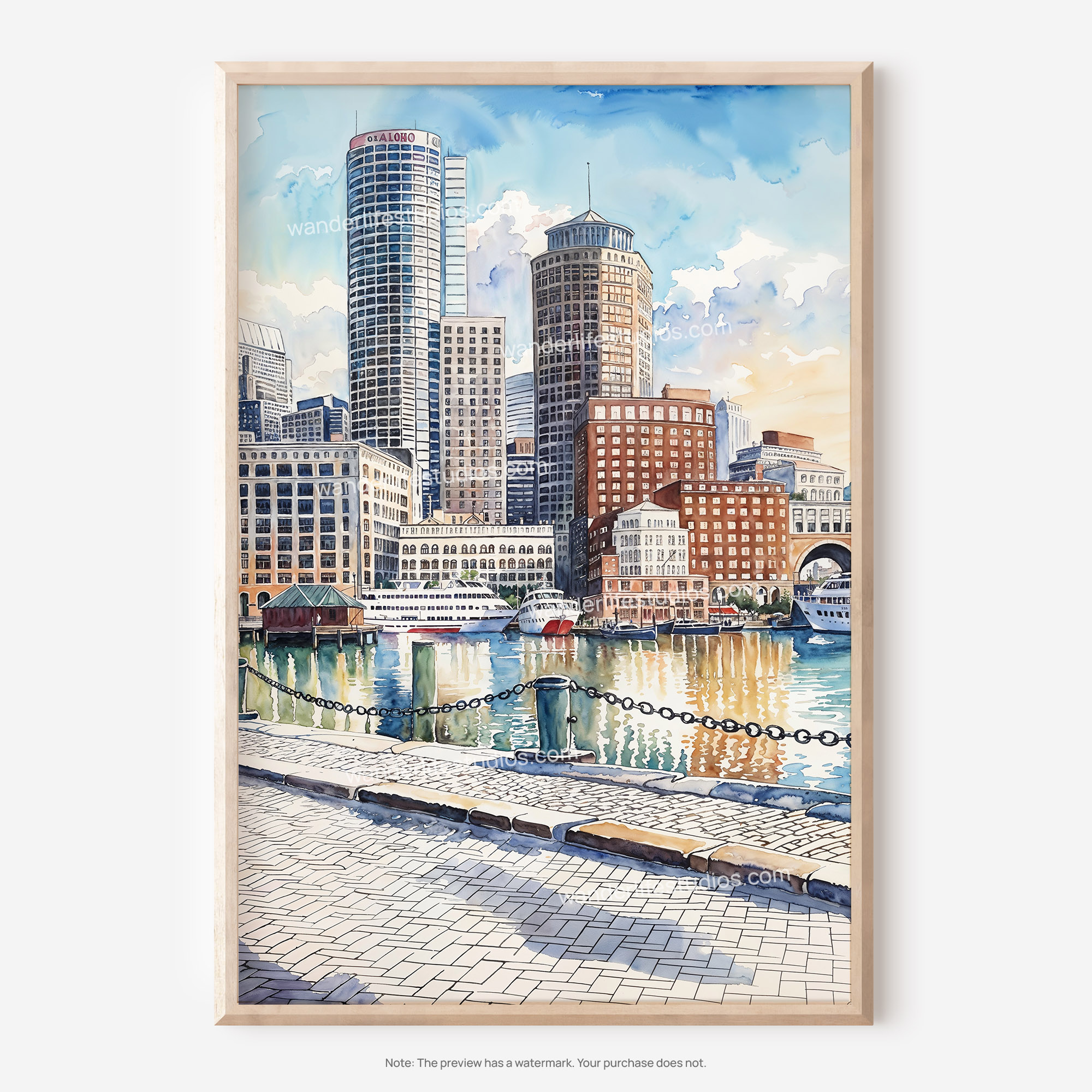 Boston Harbor Watercolor Art – Urban Cityscape Digital Download