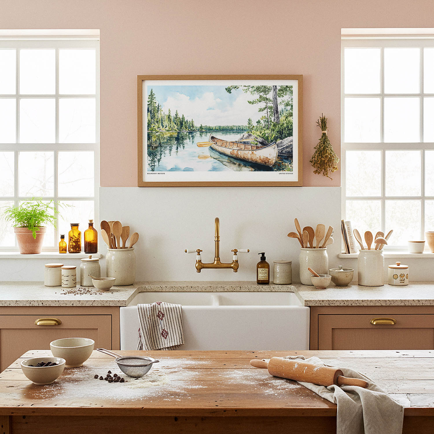 This art print showcases the peaceful landscape of the Boundary Waters, with a worn canoe resting by the water’s edge surrounded by lush greenery. Its gentle hues create a relaxing atmosphere, making it an ideal fit for a living room or cabin retreat. Perfect for anyone who cherishes outdoor adventures or serene scenery. It also makes a thoughtful gift for nature enthusiasts.