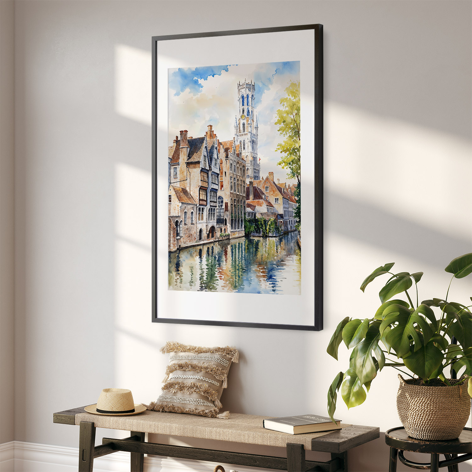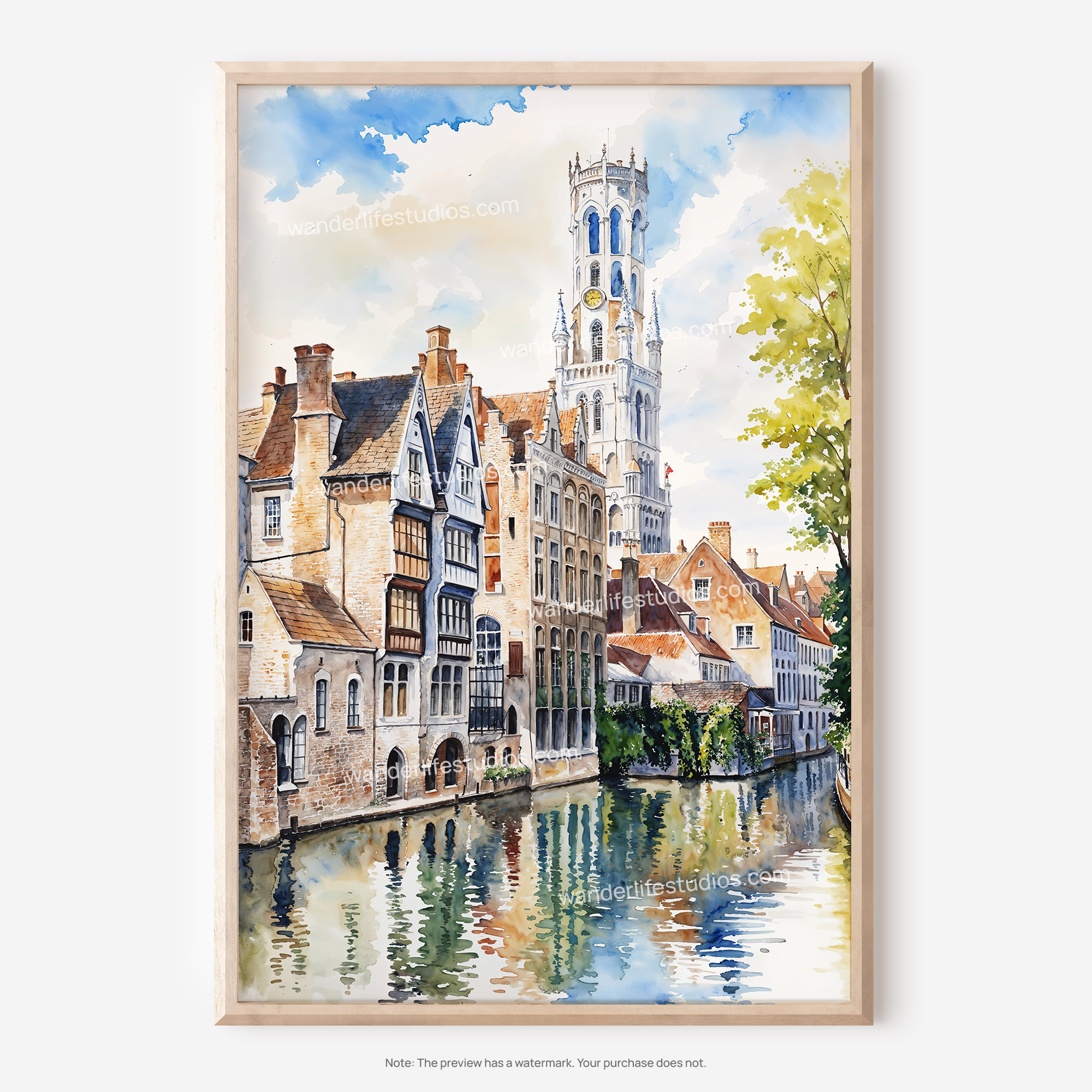Bruges Belgium Watercolor Art Print – Charming Canal Scene Digital Download