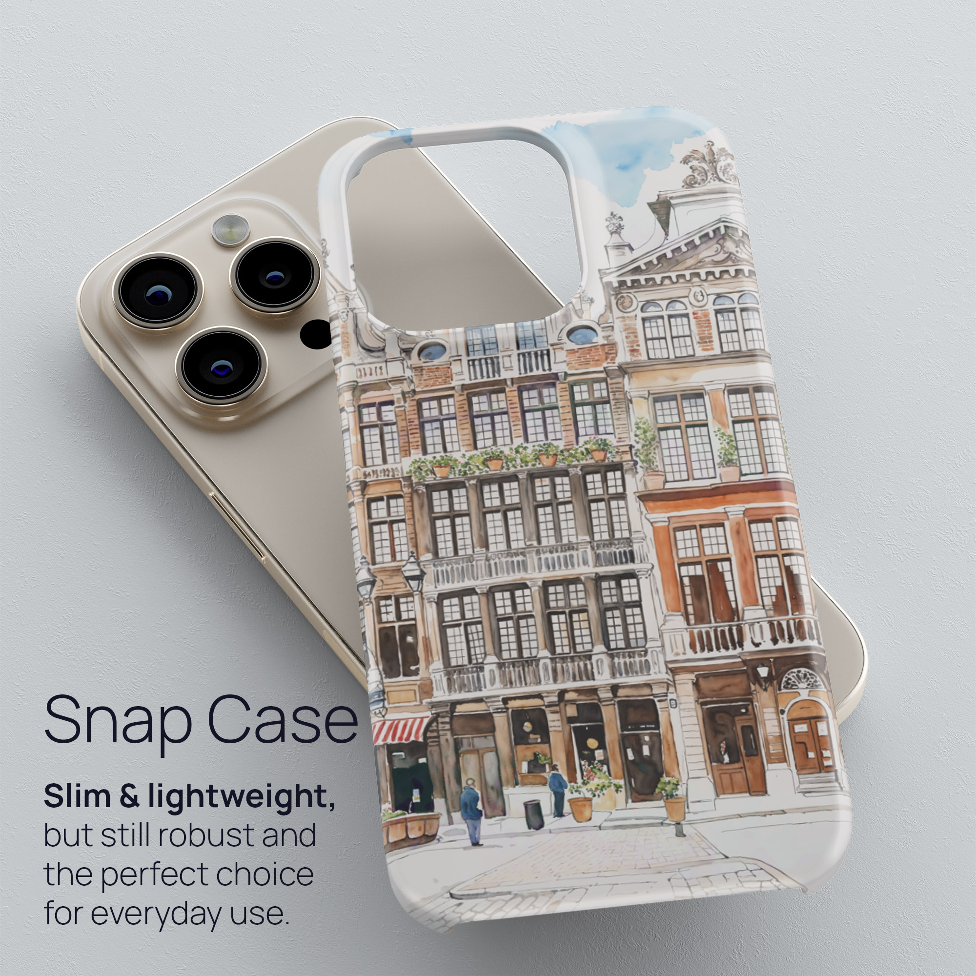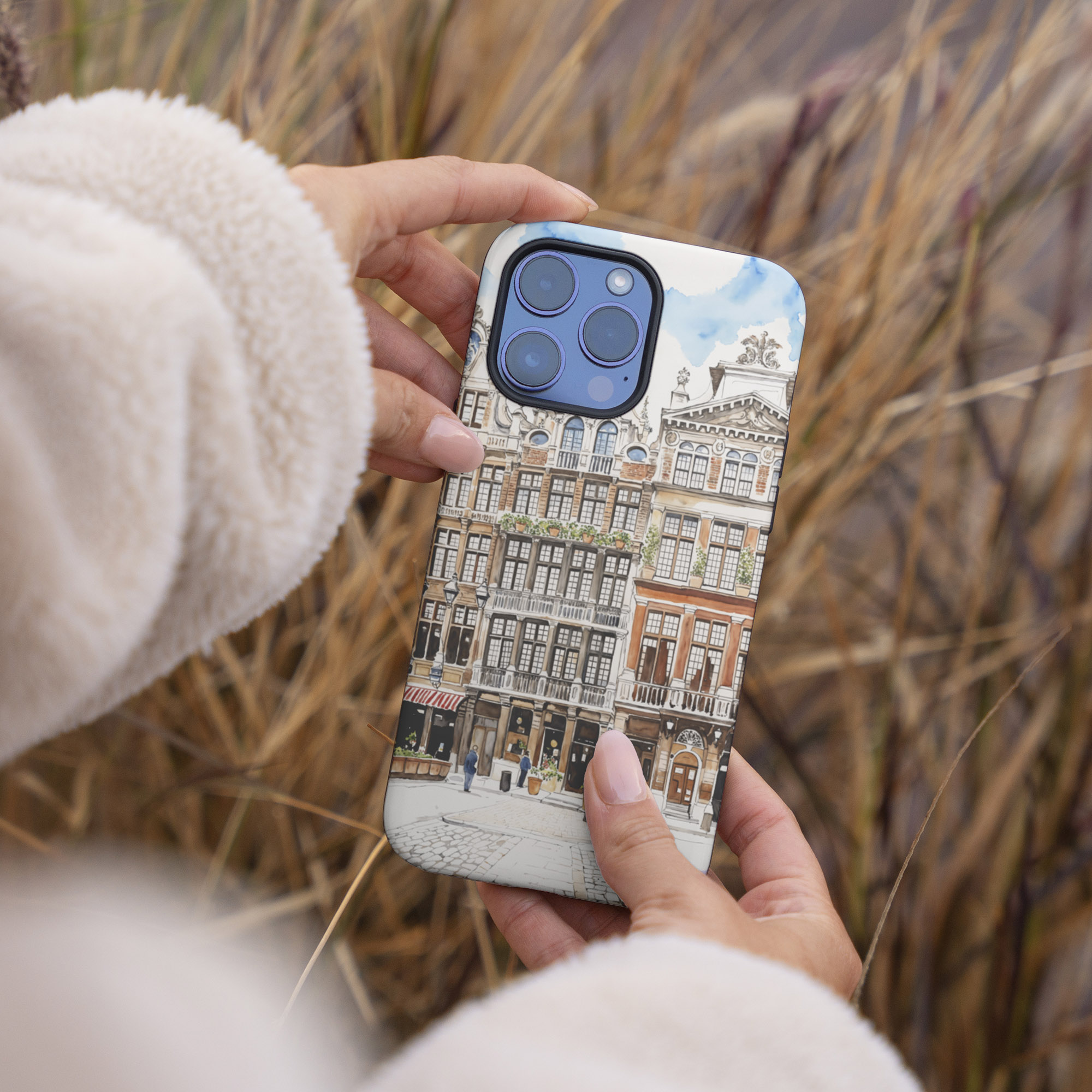 This Brussels phone case showcases charming waterfront buildings in a delicate watercolor style. It’s a practical accessory that captures the essence of the city, perfect for everyday use.