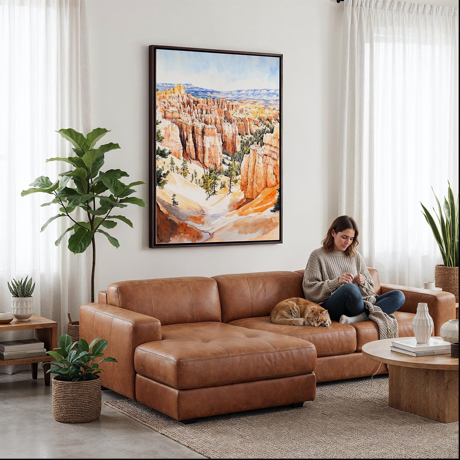 The enchanting spires and hoodoos of Bryce Canyon are beautifully captured in this watercolor canvas print. Featuring warm earth tones and soft blues, it evokes the park’s dramatic landscape and serene atmosphere.