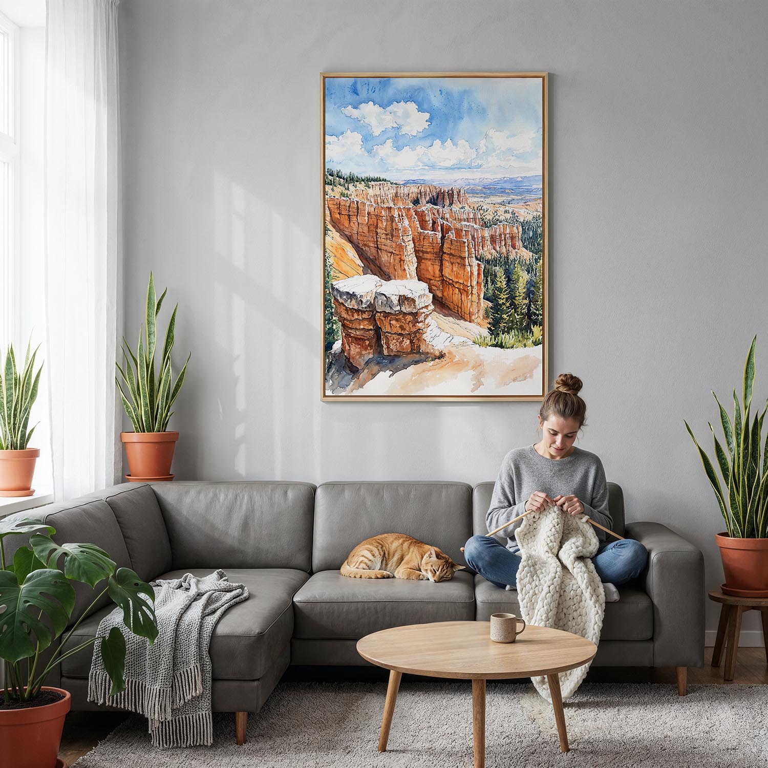 Experience the breathtaking vistas of Bryce Canyon through this captivating watercolor canvas print. It beautifully showcases the park’s unique rock formations and lush greenery, conveying the sense of adventure and awe that comes with exploring such natural wonders.
