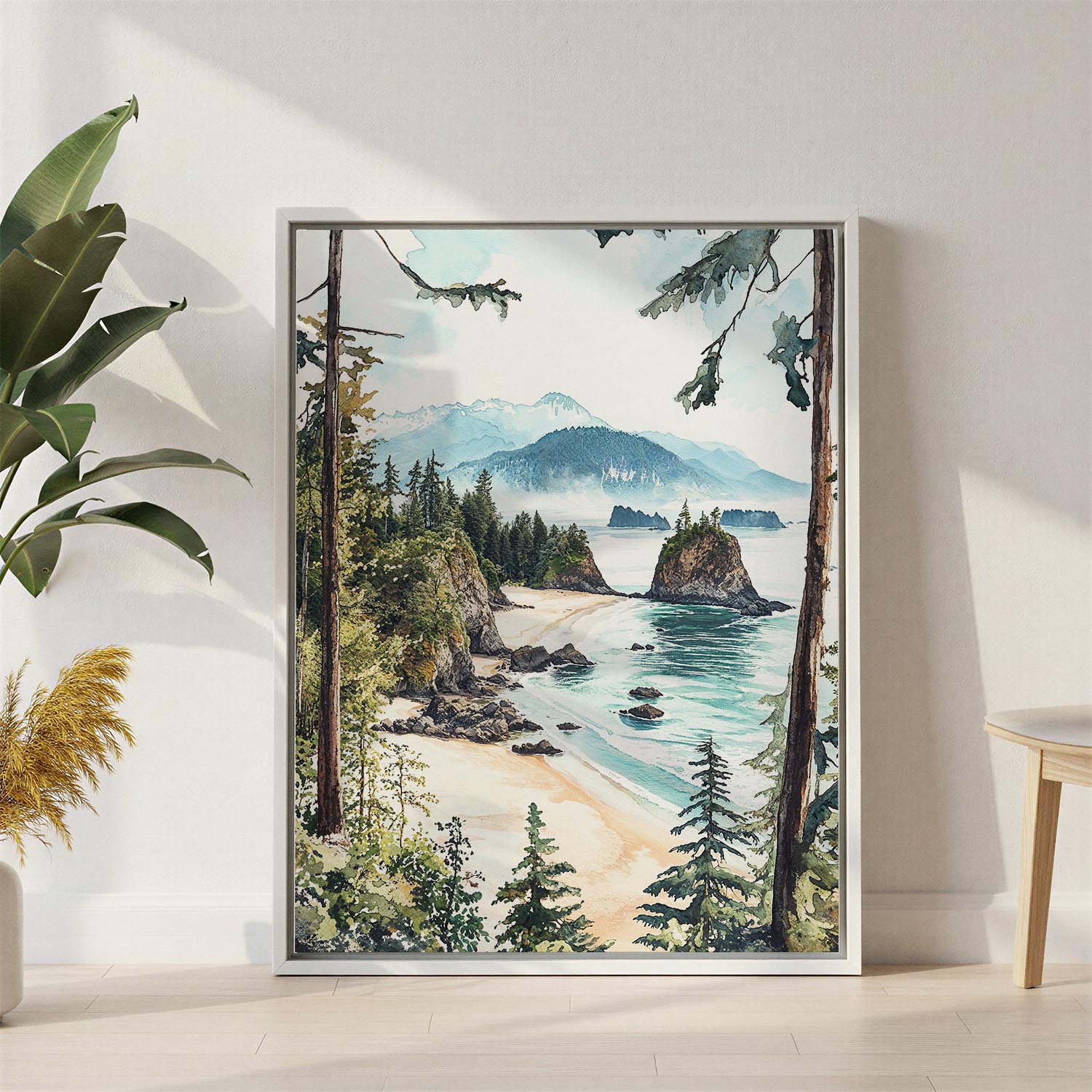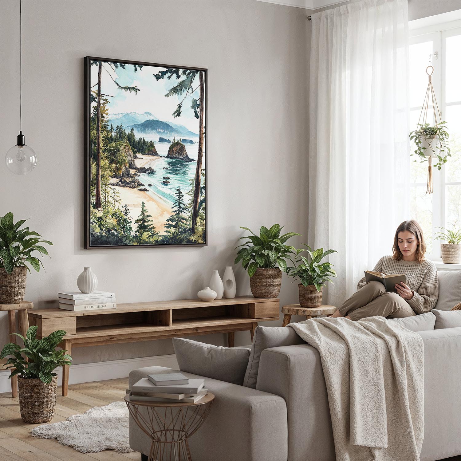 Step into the breathtaking coastal beauty of Cannon Beach, Oregon. This artwork captures the gentle waves, towering sea stacks, and lush landscapes that define this iconic location. With soft blues, greens, and sandy tones, it brings a refreshing atmosphere to your space.