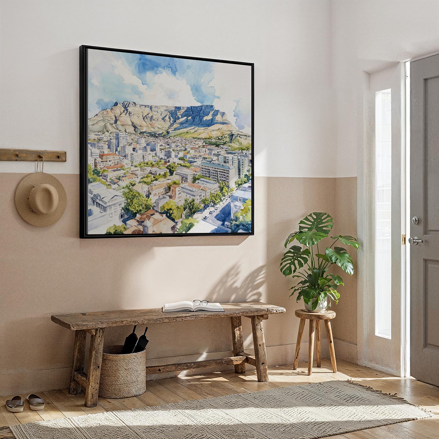 This captivating artwork captures the vibrant essence of Cape Town, showcasing its iconic skyline framed by rugged mountains. The unique square format adds a modern touch, making it a stylish addition to any room. Printed on high-quality canvas with fade-resistant inks and a matte finish, it comes ready to hang on solid wood stretcher bars. Perfect for above sofas, in hallways, or even in offices, this piece invites you to enjoy the beauty of Cape Town daily, making it a thoughtful gift or a special personal treasure.