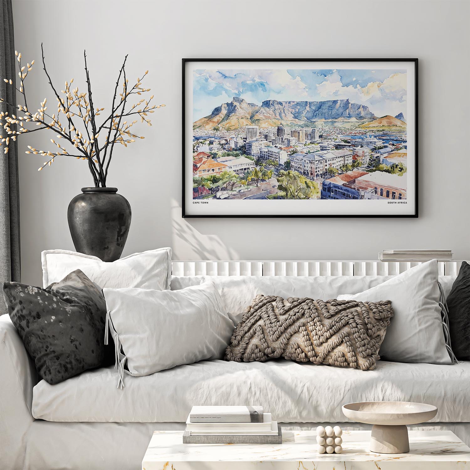 This watercolor art print captures the lively essence of Cape Town, featuring the iconic Table Mountain and city skyline. Ideal for adding character to your living room or office.