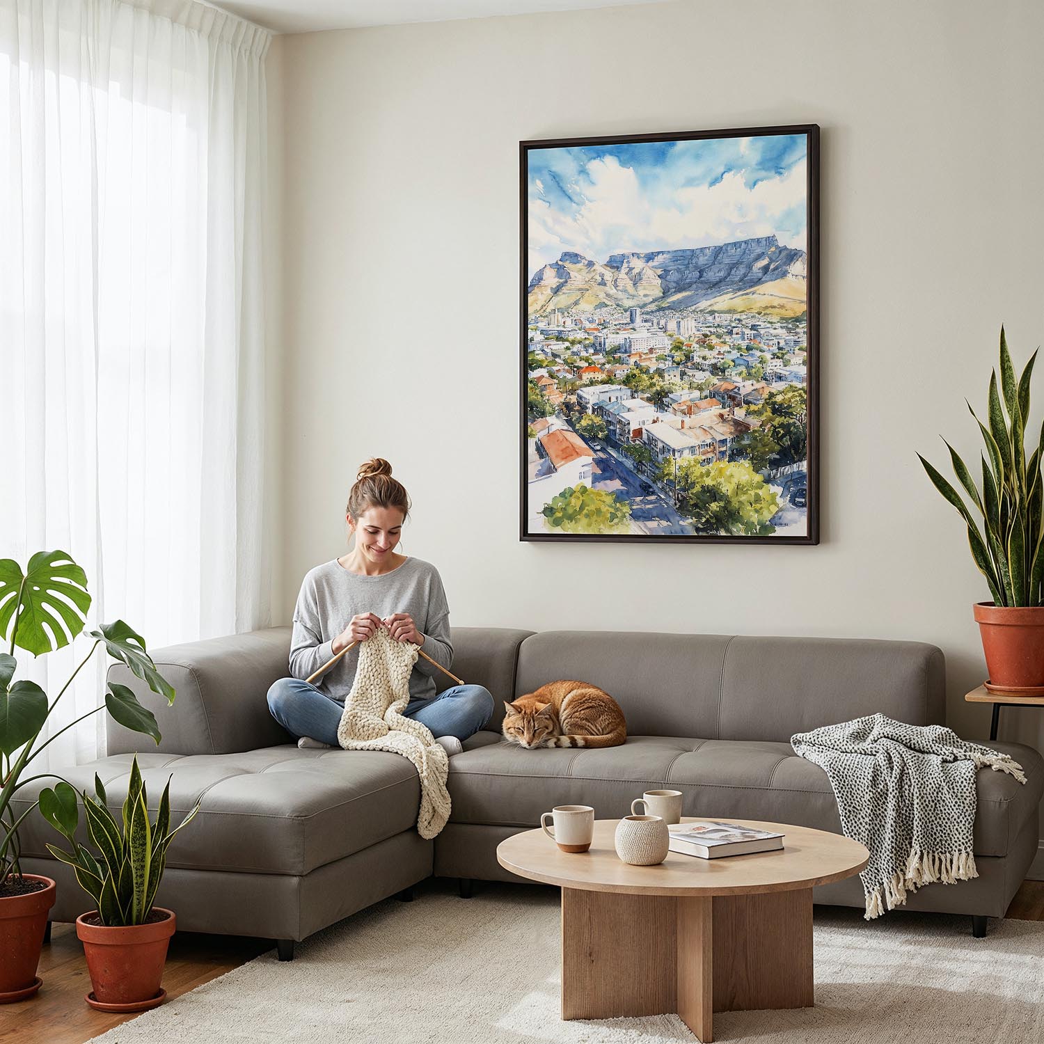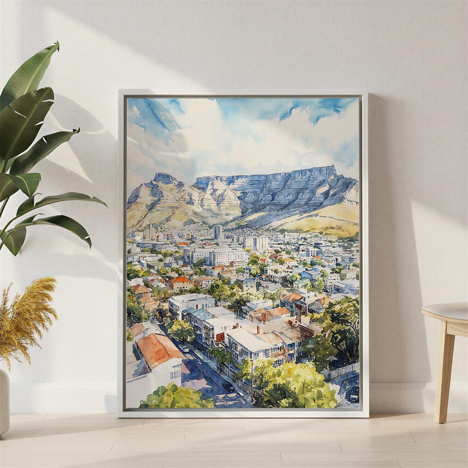 Transform your space with this watercolor canvas print of Cape Town. Showcasing the iconic mountains and vibrant city below, it’s ready to hang in your living room, office, or bedroom.