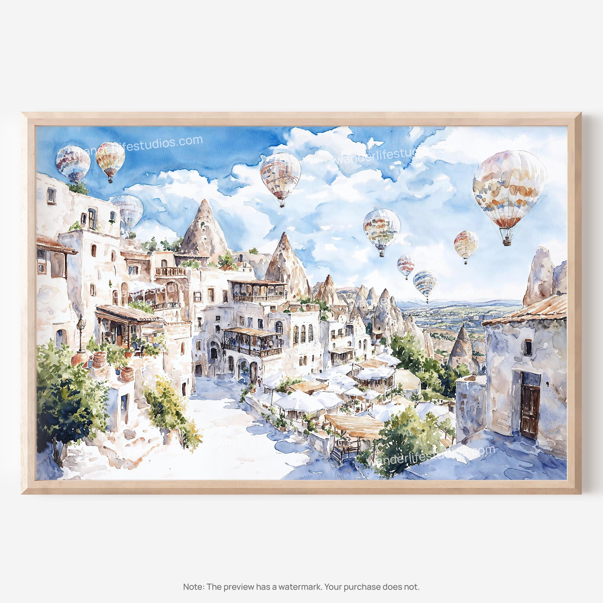 Cappadocia Watercolor Art Print – Hot Air Balloons Over Mesmerizing Landscape Digital Download