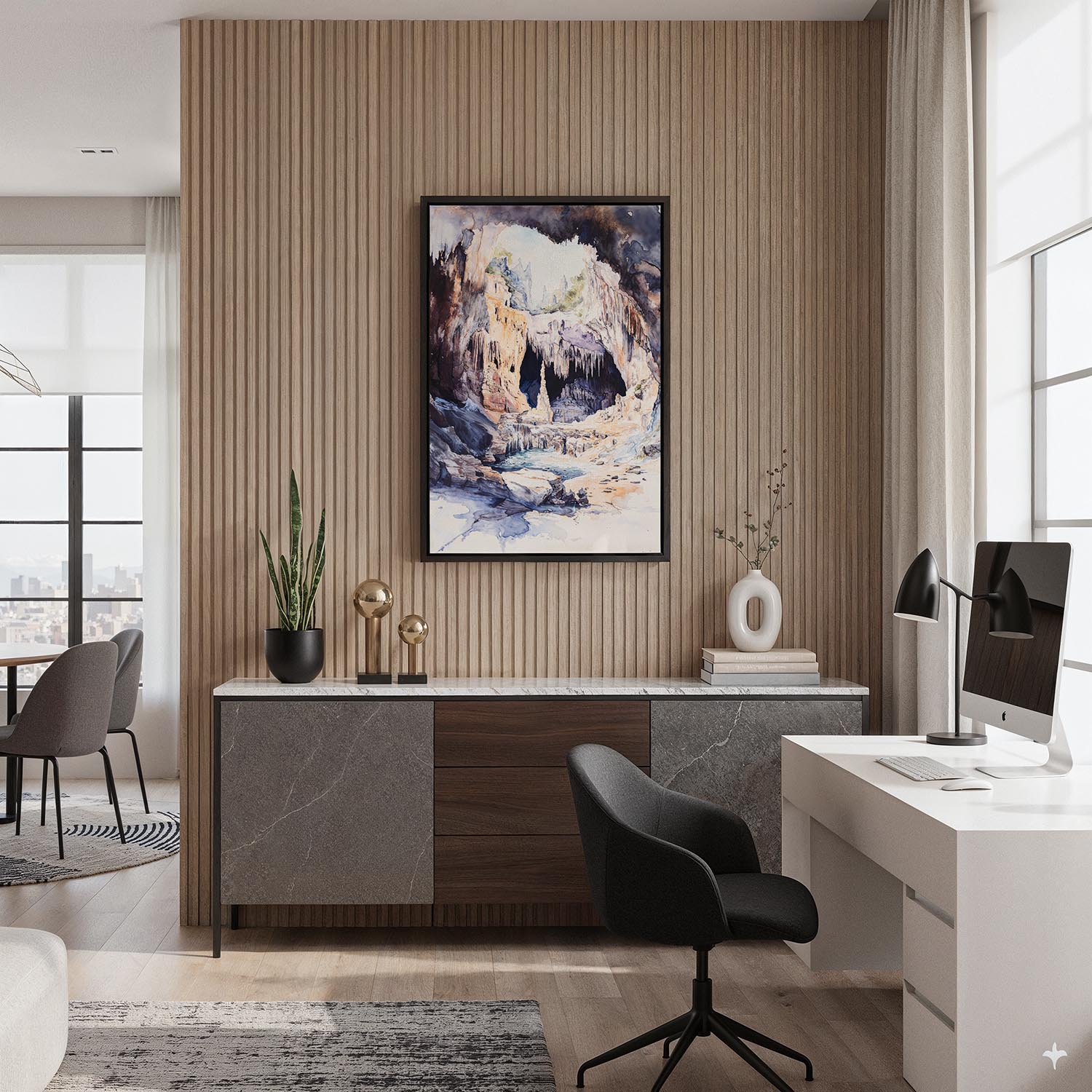 Step into the enchanting world beneath the earth with this watercolor canvas print showcasing Carlsbad Caverns National Park. The artwork beautifully captures the intricate formations and serene pools, evoking a sense of exploration and wonder.