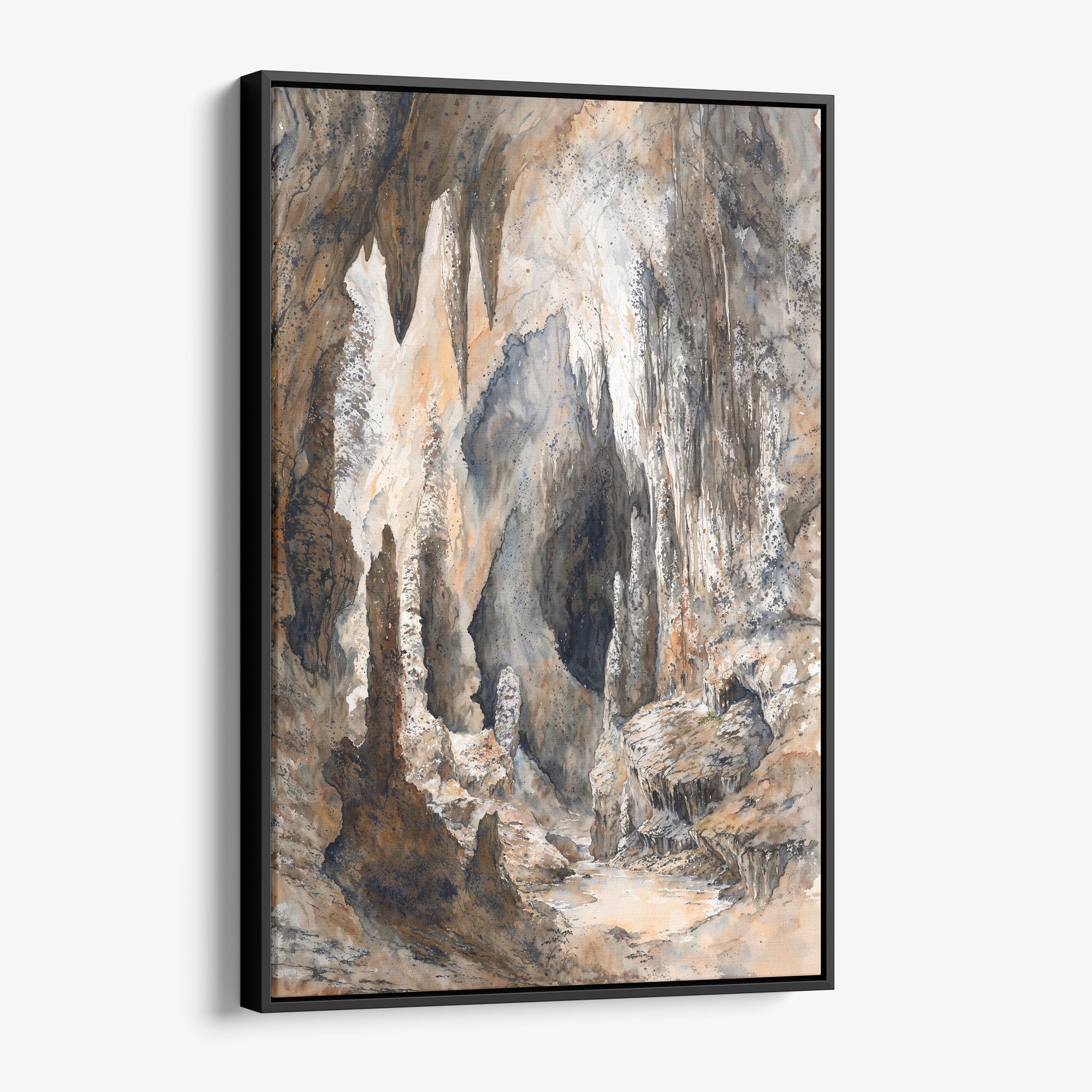 Step into the enchanting world of Carlsbad Caverns with this elegant watercolor canvas print. It portrays the stunning rock formations and earthy tones that define this natural wonder. Available in various finishes, including unframed and floater frame options, it’s designed for versatility.