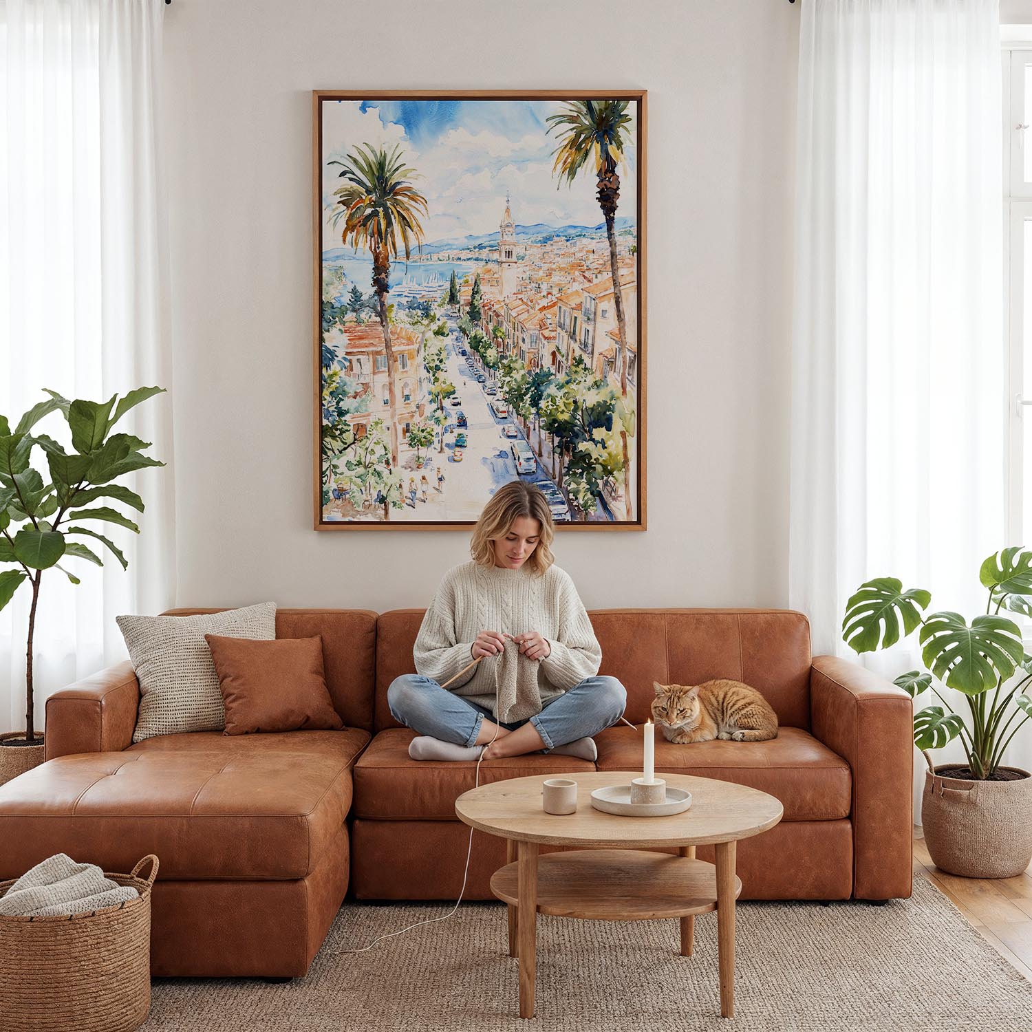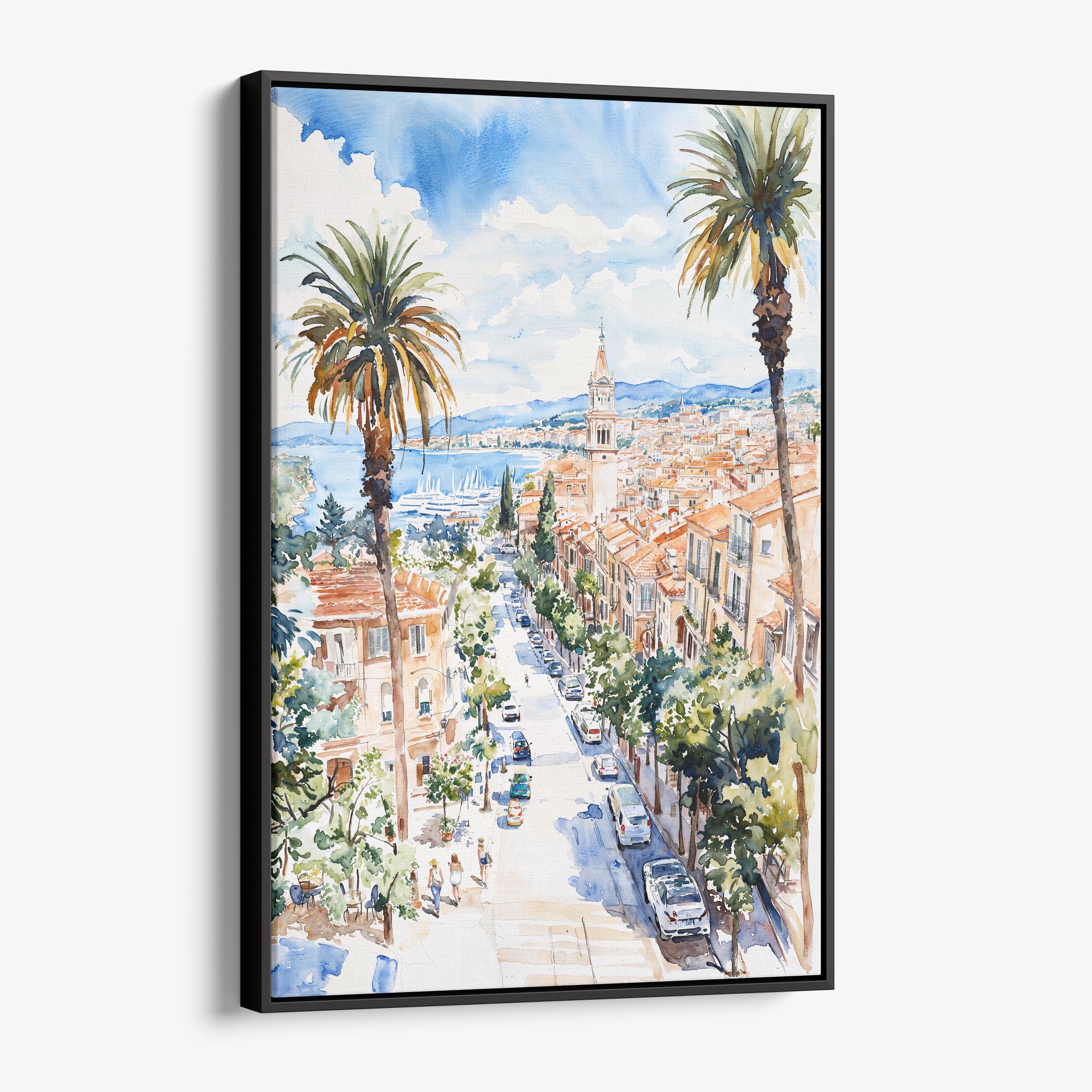 The picturesque town of Cassis comes alive in this watercolor print, showcasing lively streets lined with palm trees, colorful buildings, and the sparkling sea. This artwork beautifully captures the essence of its coastal charm and vibrant atmosphere.