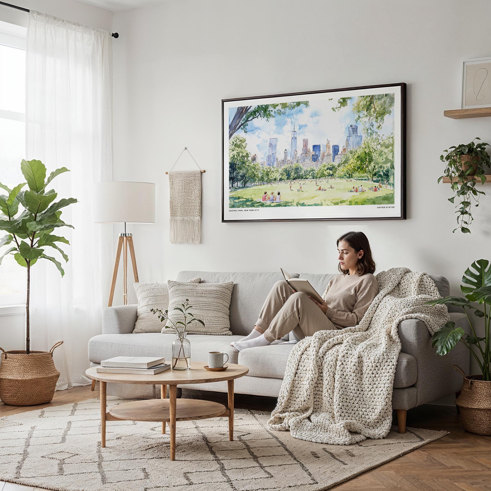 Experience the essence of Central Park with this watercolor canvas print that beautifully illustrates the park’s vibrant greenery against the New York City skyline. The artwork creates a lively and inviting atmosphere in any room, making it ideal for living rooms, offices, or bedrooms. Made with premium stretched canvas and fade-resistant inks, it arrives ready to display. This piece makes a delightful addition to your home or a thoughtful gift for lovers of urban art and city life.