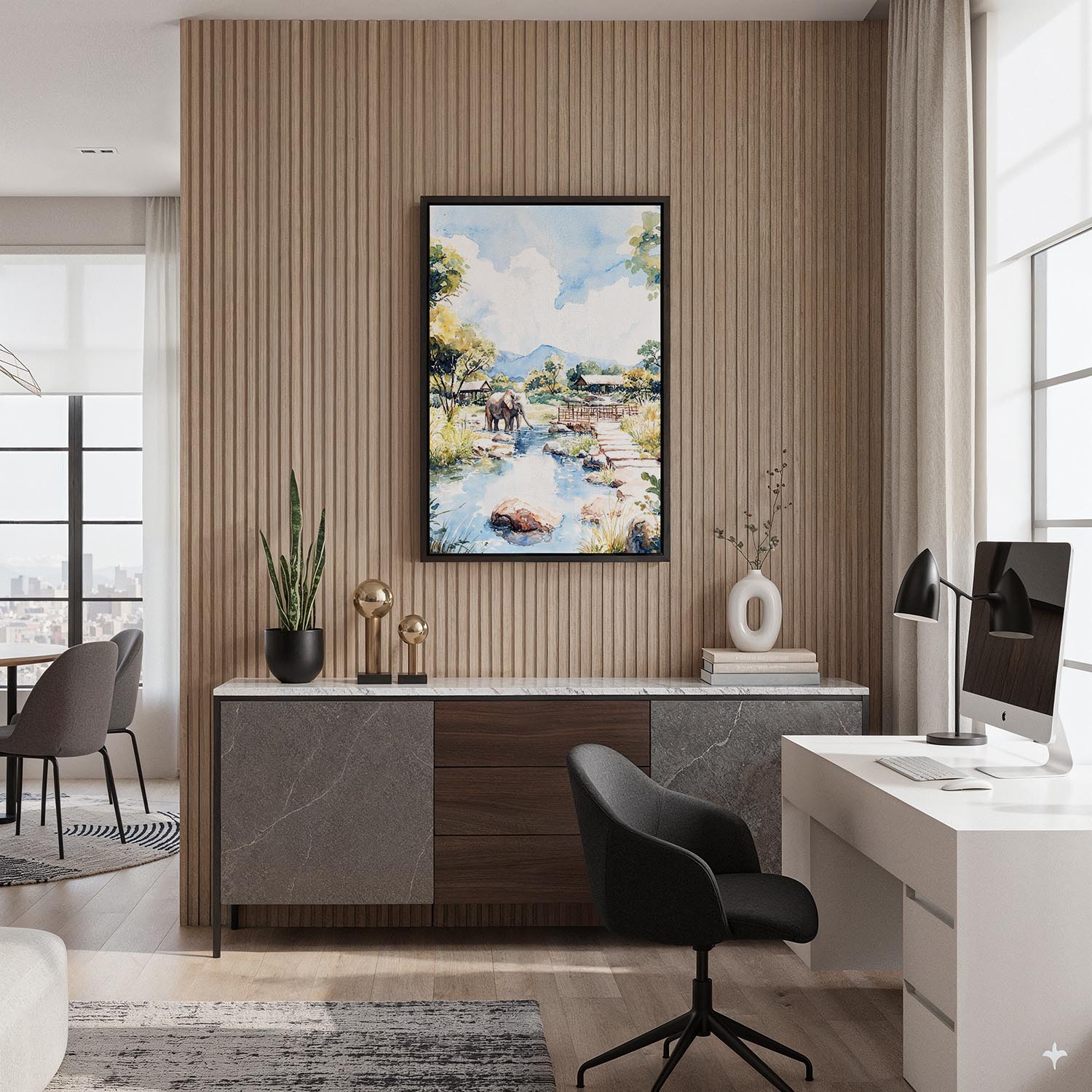 Bring the serene landscape of Chiang Mai into your home with this captivating canvas print. Featuring an elephant by a gentle stream, it’s perfect for enhancing any living space or office.