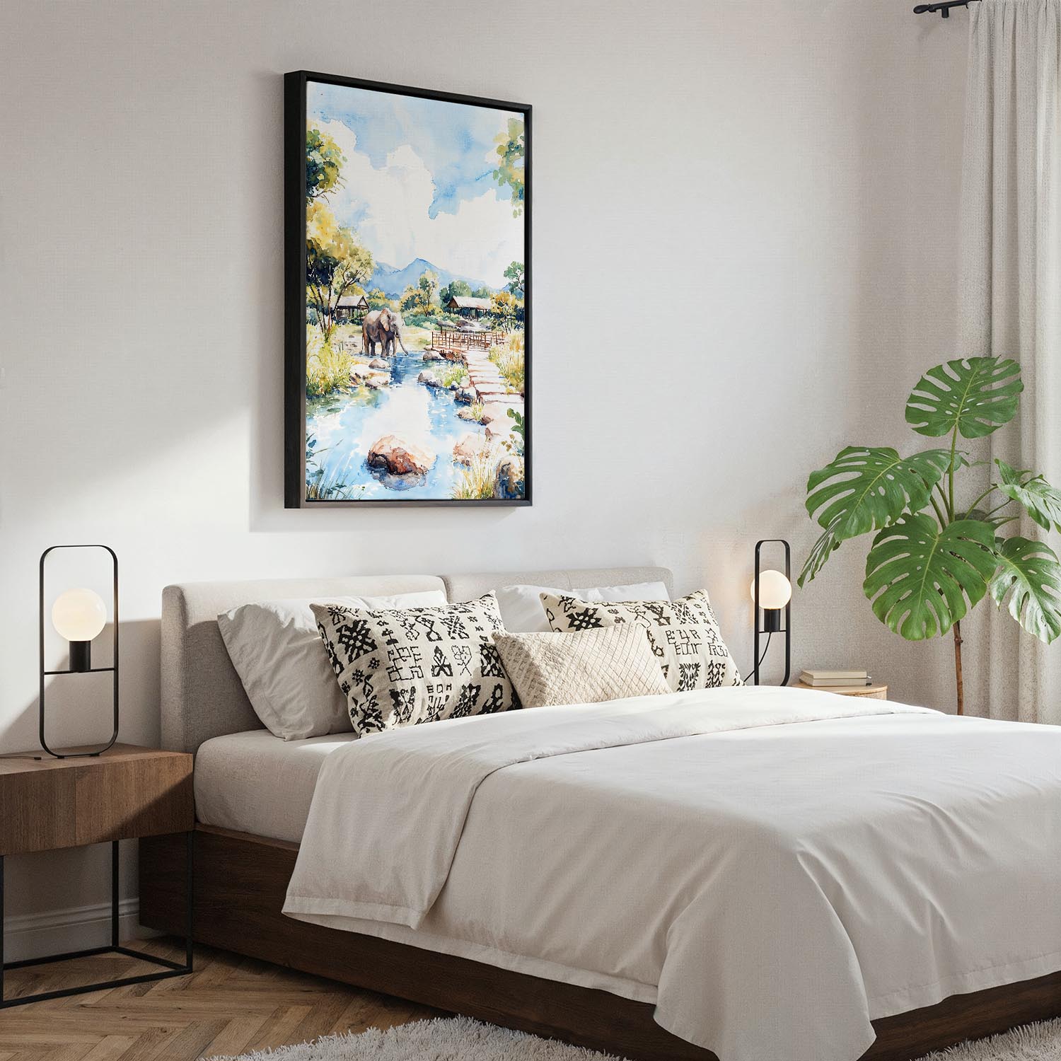 Experience the tranquility of Chiang Mai with this beautiful canvas print that captures an elephant by a peaceful stream. The soft watercolor strokes depict lush greenery and the soft outlines of mountains, evoking a sense of calm and connection to nature.