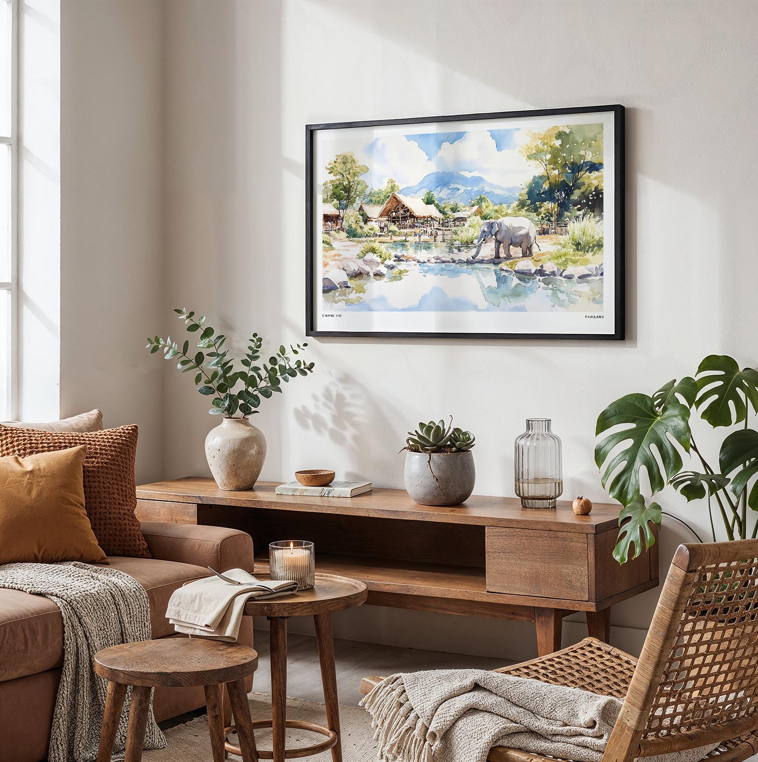 This art print beautifully depicts the charm of Chiang Mai, showcasing a gentle elephant near serene waters—a scene that evokes peace and connection with nature.