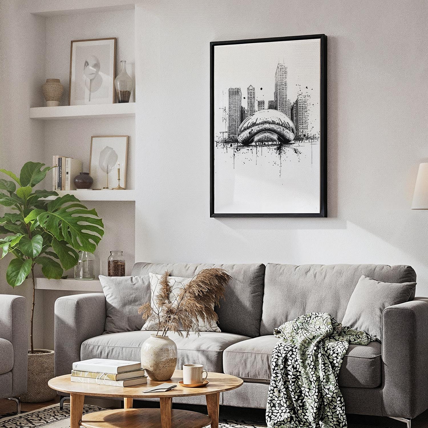This elegant canvas print features the iconic Chicago Bean surrounded by the city’s skyline, captured in a detailed pencil drawing. It’s ready to hang, making it a wonderful addition to your living room, office, or any space that celebrates urban life.