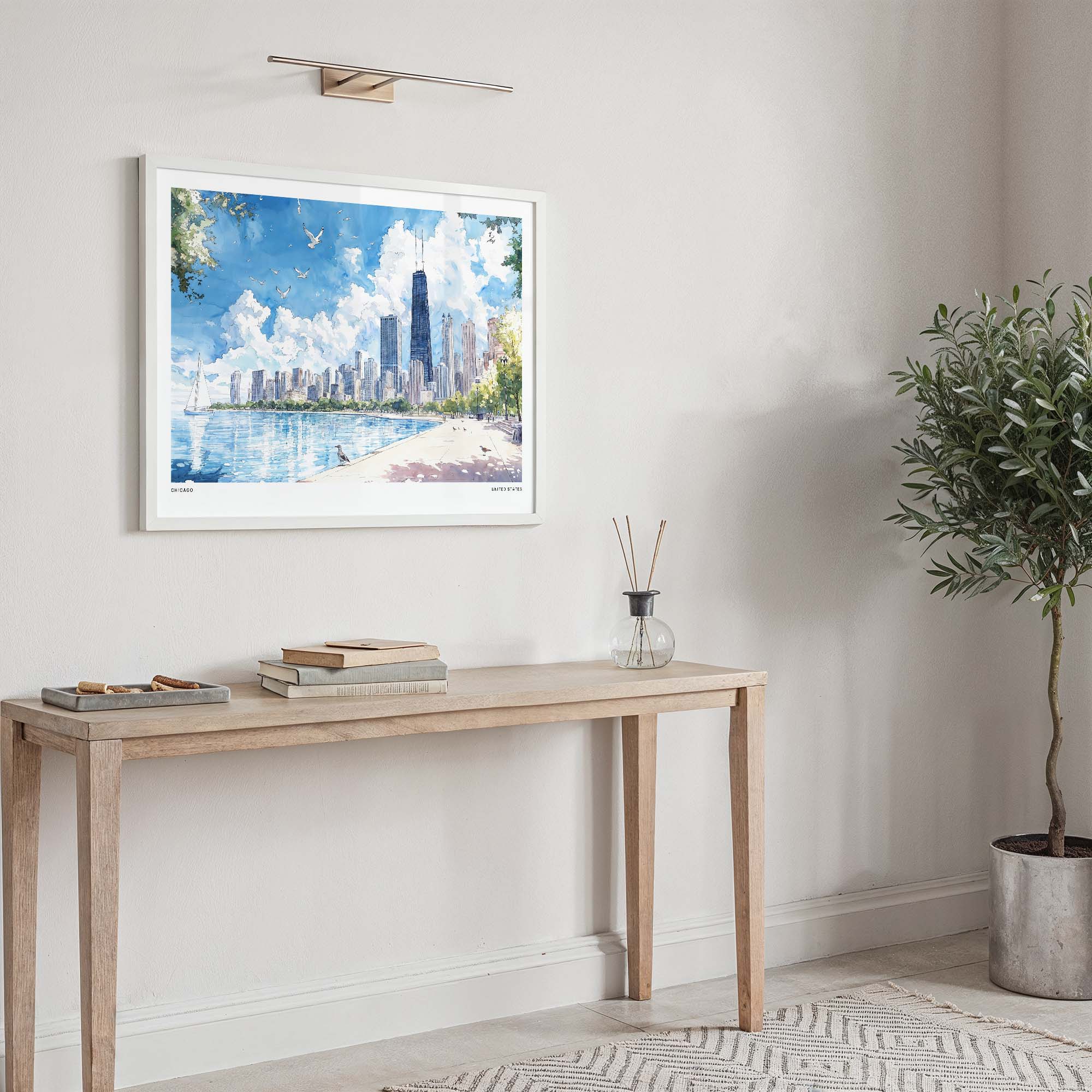 This artwork beautifully represents the iconic skyline of Chicago, showcasing its notable buildings against a bright blue sky and tranquil waters. The watercolor style adds a lively yet serene energy, making it a great conversation piece in your home. Delivered as a high-resolution JPG file, you can easily print this stunning piece at home or with a local print shop. Perfect for enhancing living rooms, home offices, or anyone who has a love for urban landscapes, this instant download allows you to enjoy the beauty of Chicago’s skyline at your convenience.