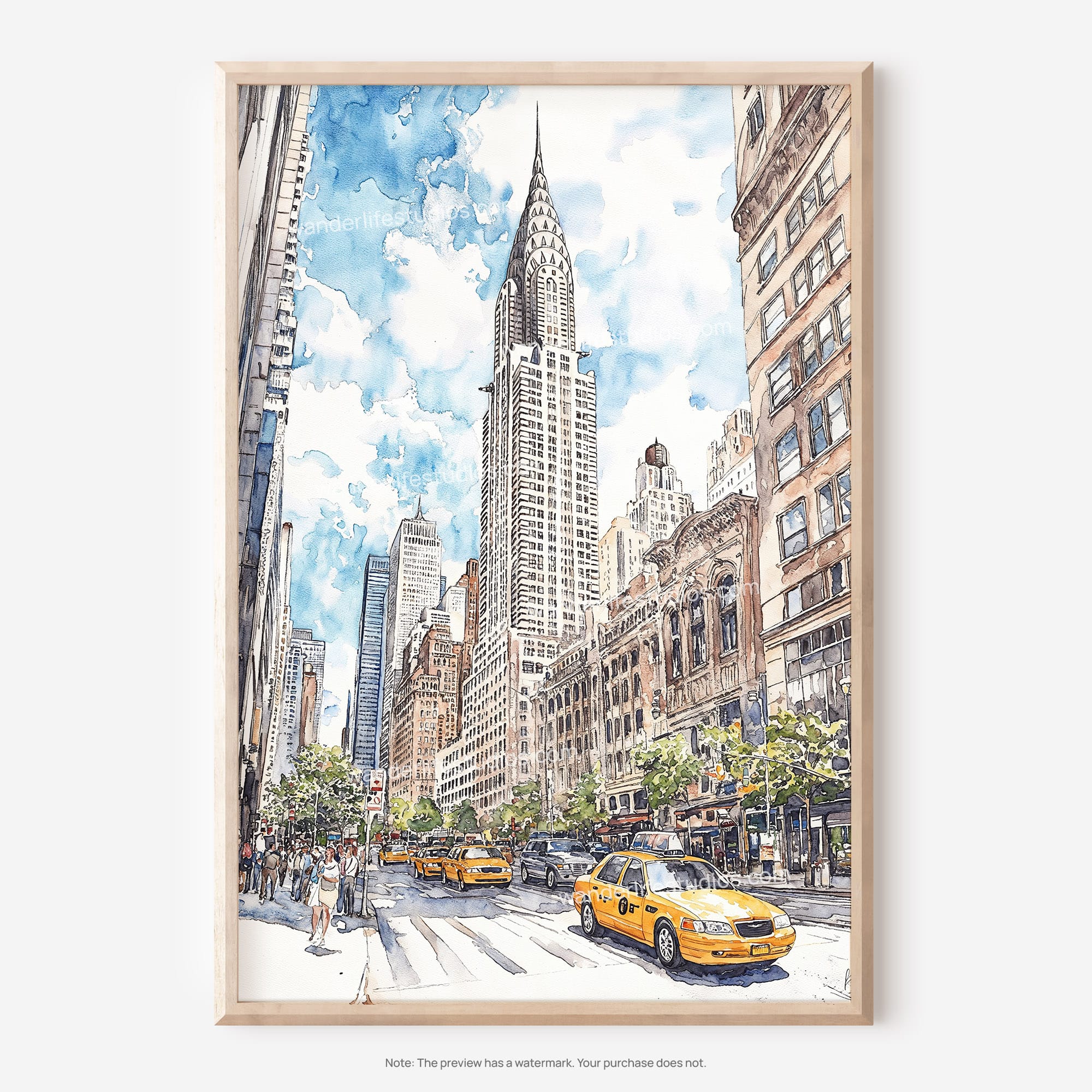 This artwork captures the iconic Chrysler Building amidst the bustling NYC streets, showcasing its architectural beauty in a watercolor style. The piece evokes feelings of adventure and urban charm, making it perfect for enhancing your living room, office, or any space where you want to inspire creativity. Delivered as a high-resolution digital file, it’s simple to print at home or through your local print shop. Enjoy instant access to elevate your walls or to share as a unique gift.