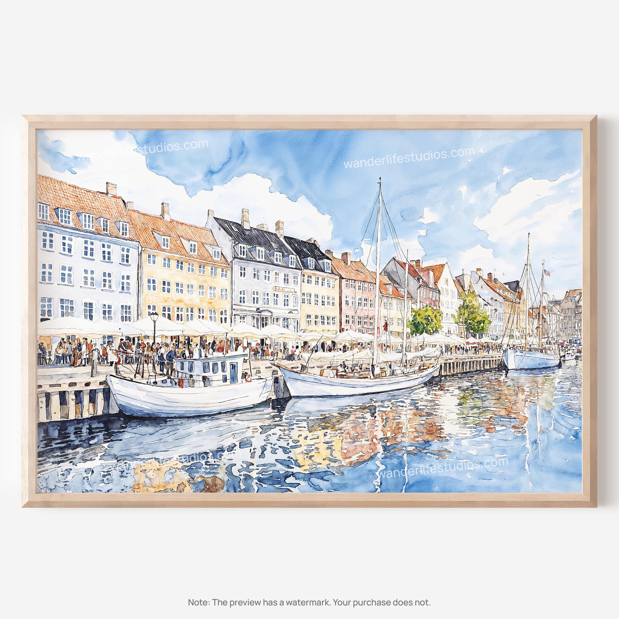 Copenhagen Denmark Harbor Watercolor Art Print – Digital Download for Home Decor